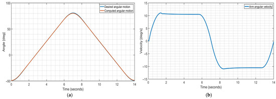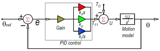 with ts as the interval from zero to constant velocity; tx is the interval at constant velocity; and tf is the interval from constant velocity to zero. Using motion characteristics for cycle motion of 14 s that is segmented in accelerated and decelerated motion for 20% of the cycle time and with 60% constant velocity motion, the acceleration coefficient αo in Equation (17) is 30.4 deg/s2 and the velocity coefficient ω is 21.3 deg/s. Thus, the PID control can be designed, as in Figure 9, with error given as