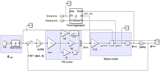 The first block from the left is the angle function which gives the transfer function that receives time as an input and gives the desired reference angle θref as in Equation (17). The output to this block is used to give the error e signal. The error e is converted from degrees to radian and through the input gain (Gain) goes into the PID block. The PID block yields the net input driving torque as