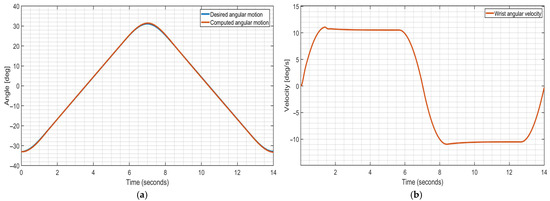 The PID constants kp, ki, and kd can be derived from Table 3 and Equation (16) as 0.68, 0.23, and 0.55, respectively. The gain is associated with the mass property of the system. While the gain 1/J is derived as 17.24/kg.m2, the input gain (Gain) is a product of the moment of inertia J and an in input gain factor (IGF), which is an incrementing factor greater than one; IGF is used as a tuning for the PID control to match the input with the output depending on the cost of control (available power of the actuator) and desired performance of the motion exercise. Since it is expected that the device will serve a wide range of arm sizes, an input gain factor (IGF) of 2 is assumed.