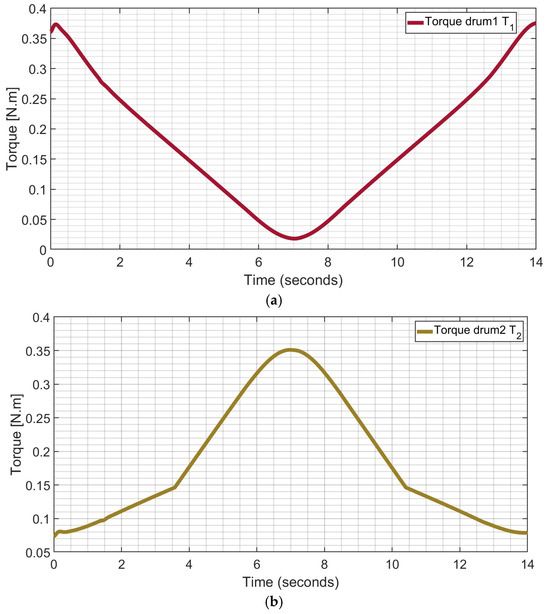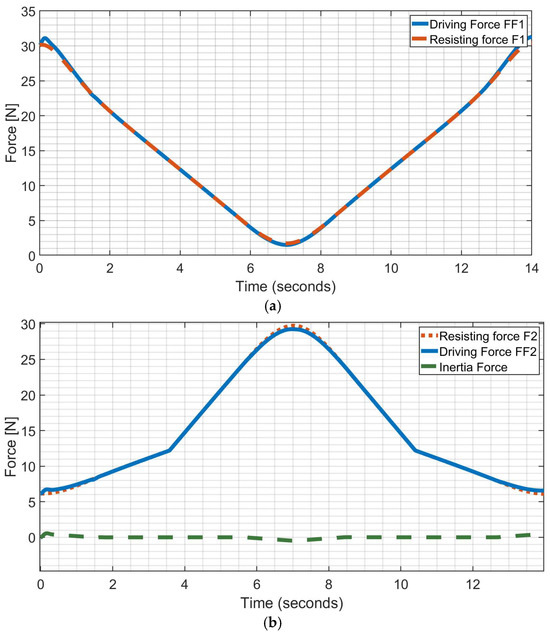 The designed PID control, as in Figure 9, ensures a proper driving torque TF1 for smooth controlled assisted motion by using Equations (14)–(19). The controller has only one integrator that is part of the PID system and the other integrator is just the ‘motion model’ which indicates the mass properties of the physical model as expressed in Equation (14) with features shown in Figure 9 and Figure 10. Considering the low-speed motion and low-accuracy request in the limb motion assistance, the design PID control has been satisfactorily tuned only with the Hurwitz criterion. Low-speed exercise motion is suggested by physiotherapists when dealing with either rehabilitation therapies or exercising of elderly people. Low-precision assisted motion is justified by the human arm precision that is even less demanding when dealing with elderly people.