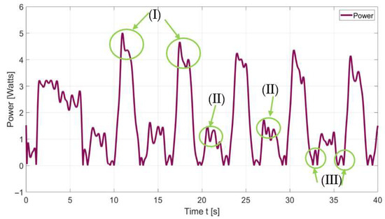 The acquired power consumption data were noisy and then they were filtered using the Butterworth low-pass filter at a sampling frequency of 100 Hz, cutting off frequencies higher than 2 Hz. There are three characteristic features of the plot in Figure 22 that are marked as (I), (II), and (III) zones, referring to the following aspects: