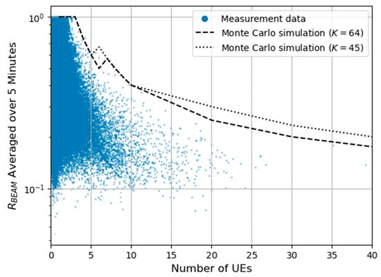From the viewpoint of propagation, the number of UEs using FR1 is greater than that using FR2 in many commercial networks [17,18]. In this study, the period during which the number of UEs was three or more accounted for only approximately 1% of the month. In contrast, it is estimated that cases where the number of UEs is less than three are rare in the BF-RBSs for FR1. However, the previous measurement study [13] also showed that the actual transmitted power from BF-RBSs for FR1 was the maximum when the number of UEs was less than ten. Based on the measurement and Monte Carlo simulation results, when the number of UEs was 10 or more, there were no cases in which more than 50% of all UEs were concentrated on a specific beam. On the other hand, this study does not exclude certain situations in which UEs were concentrated on a specific beam due to geographical factors. From a conservative perspective, this study concludes that mobile operators should control and monitor the actual transmitted power of BF-RBSs, regardless of whether they are for FR1 or FR2.