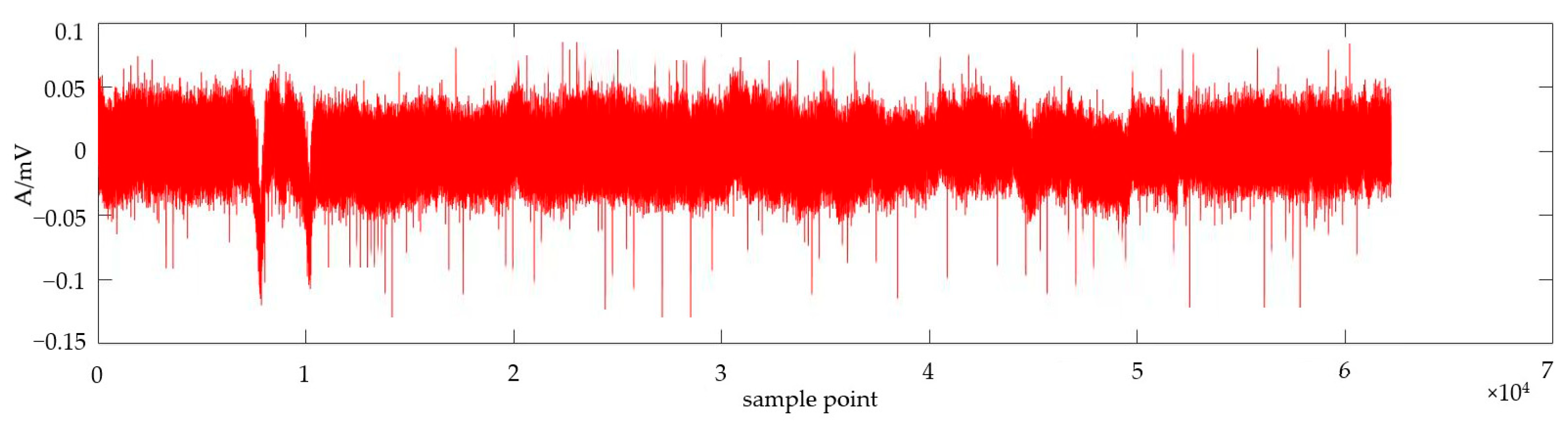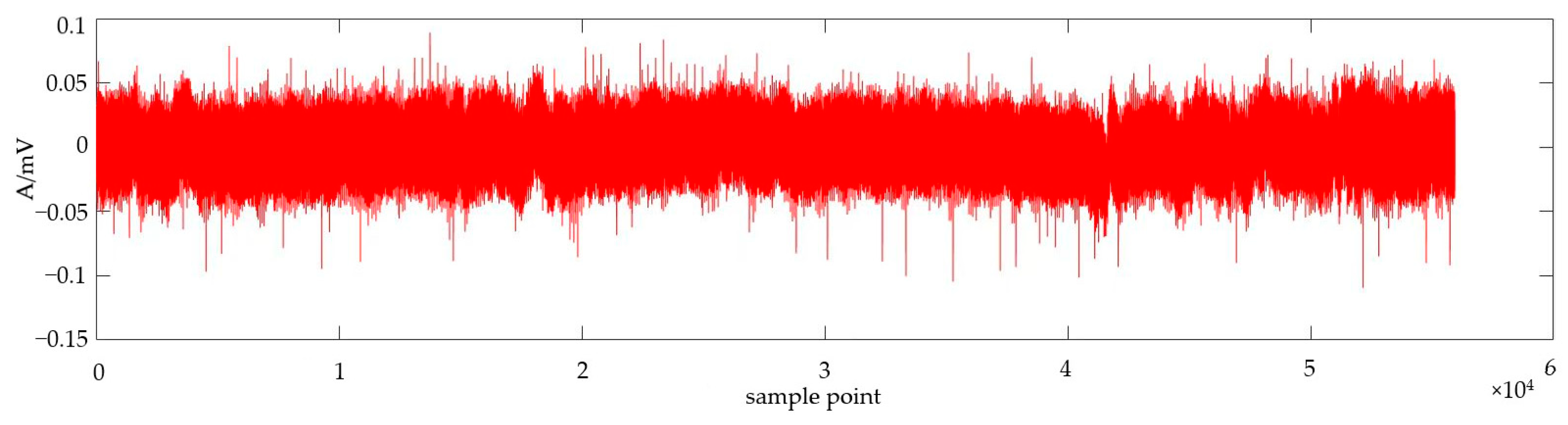 Table 5, the runtime of the CEEMDAN-IWT method increases approximately linearly with both signal length (N) and ensemble size (I). Under the same I, when N increases from 1500 to 15,000 (a 10-fold increase), the runtime rises by about 12–14 times; under the same N, when I increases from 50 to 200 (a 4-fold increase), the runtime increases by approximately 3.6–3.9 times. The memory usage shows a moderate upward trend with the growth of N (when N increases 10-fold, memory rises from 865 KB to 3569 KB), but remains basically stable with changes in I, indicating that memory consumption is mainly determined by the signal decomposition scale.