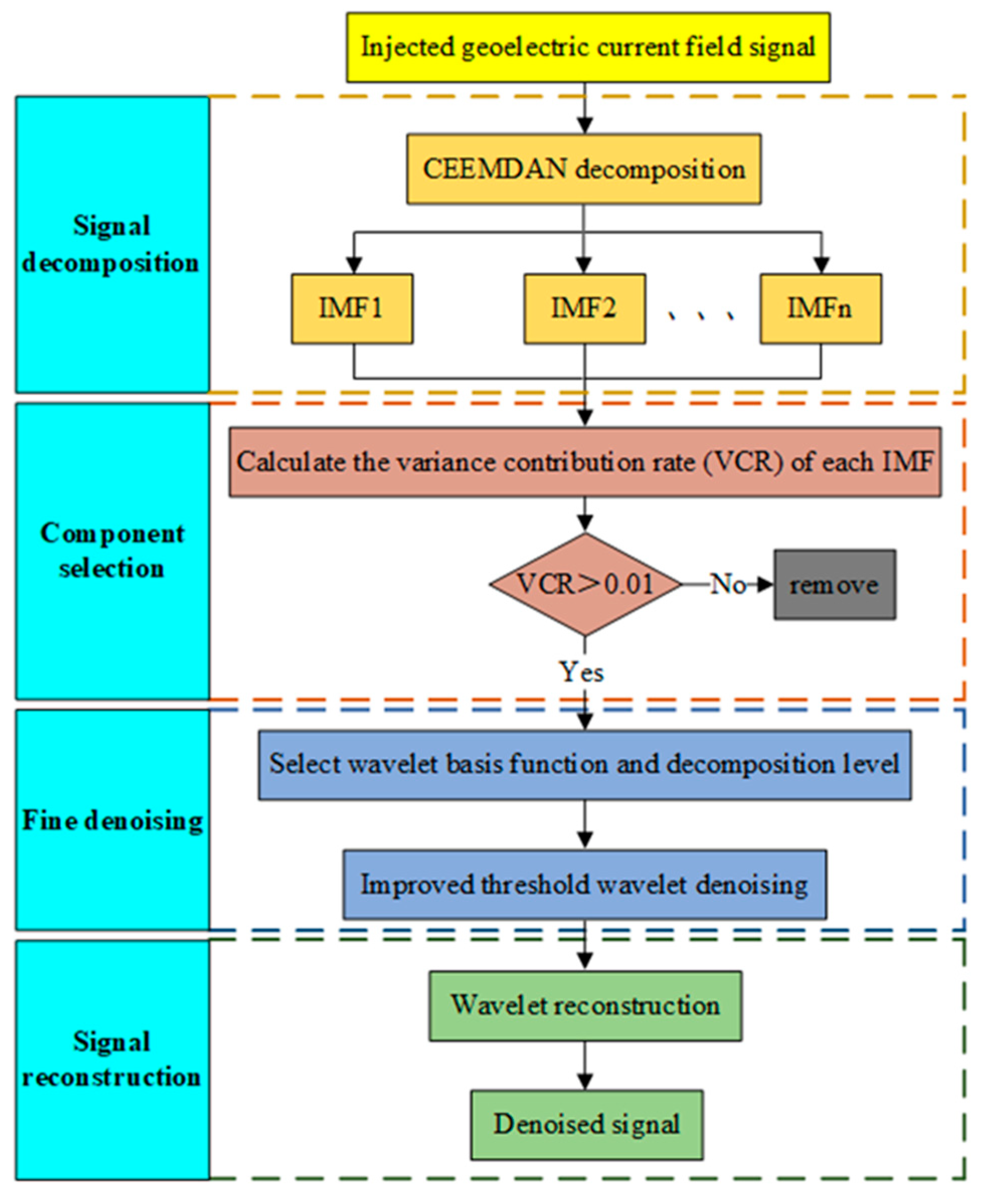The above research results indicate that the method proposed in this study, through the synergistic effect of CEEMDAN and improved wavelet threshold denoising, not only better preserves the key information of the geoelectric current field signal, preventing the loss of critical information in geological analysis, but also significantly outperforms traditional methods in terms of various precise quantitative indicators and environmental adaptability. This achieves the optimal balance between noise suppression and signal fidelity. Although this method slightly increases the computational load, it significantly enhances signal fidelity and reliability. Its two-level synergistic processing framework minimizes signal distortion and improves processing accuracy, providing high-quality data support for subsequent underground electrical parameter inversion and geological structure analysis.