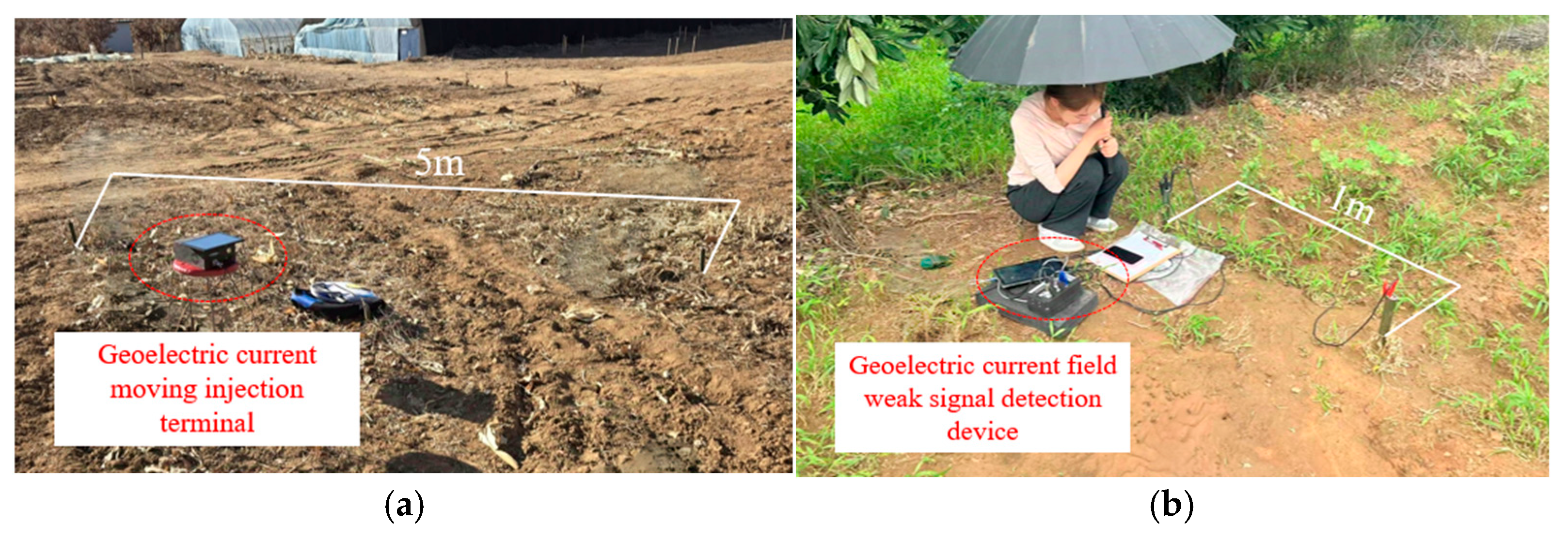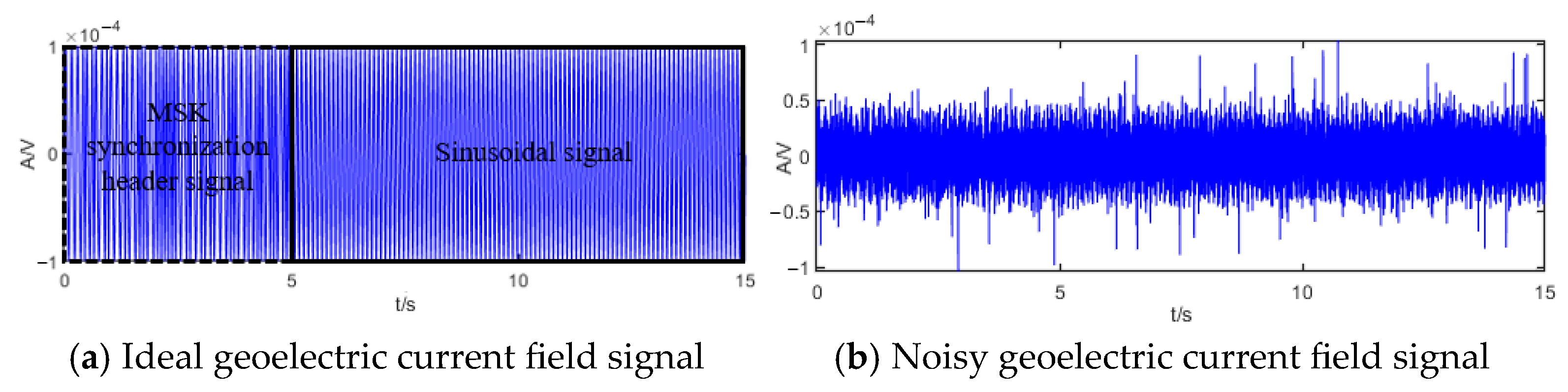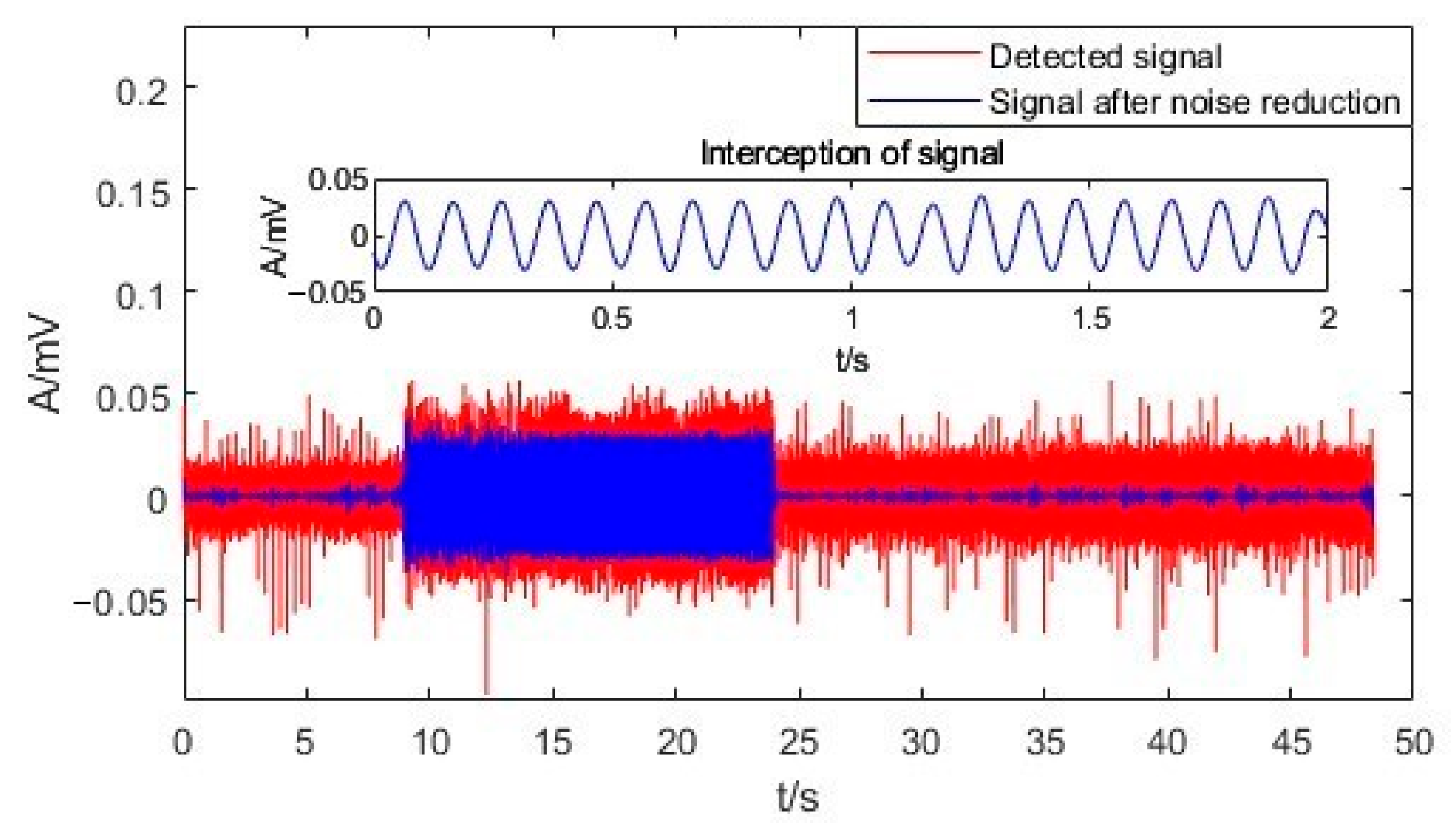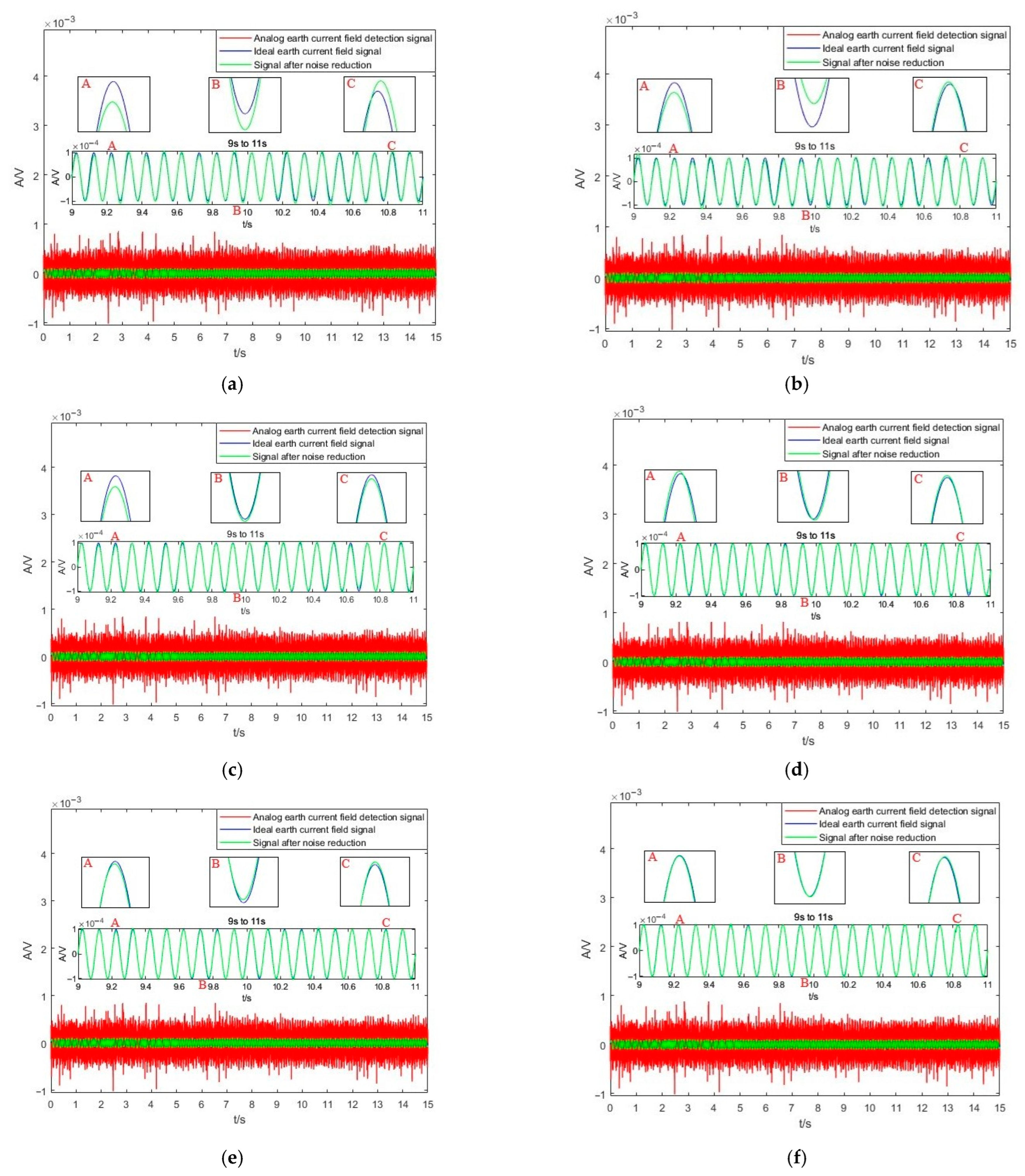 The above results indicate that when the threshold is set to 0.01, both the and reach their highest levels, achieving the best denoising effect. When the threshold is set to 0.005, the selection criterion is too loose, which leads to the residual presence of some noise-dominant IMF components due to insufficient filtering. Although a small amount of noise is suppressed, the proportion of residual noise increases, resulting in a decrease in both and . On the other hand, when the threshold is raised to 0.02, the filtering becomes too strict, leading to excessive elimination of IMF components and thus causing the loss of effective signal, which results in the lowest and values. In conclusion, the effective energy of the injected electric field signal is mainly concentrated in a few mid-to-high frequency IMF components, while the variance contribution of the noise components is generally low. The threshold of 0.01 effectively removes most noise components without excessively losing the effective signal, achieving an optimal balance between noise suppression and signal fidelity.