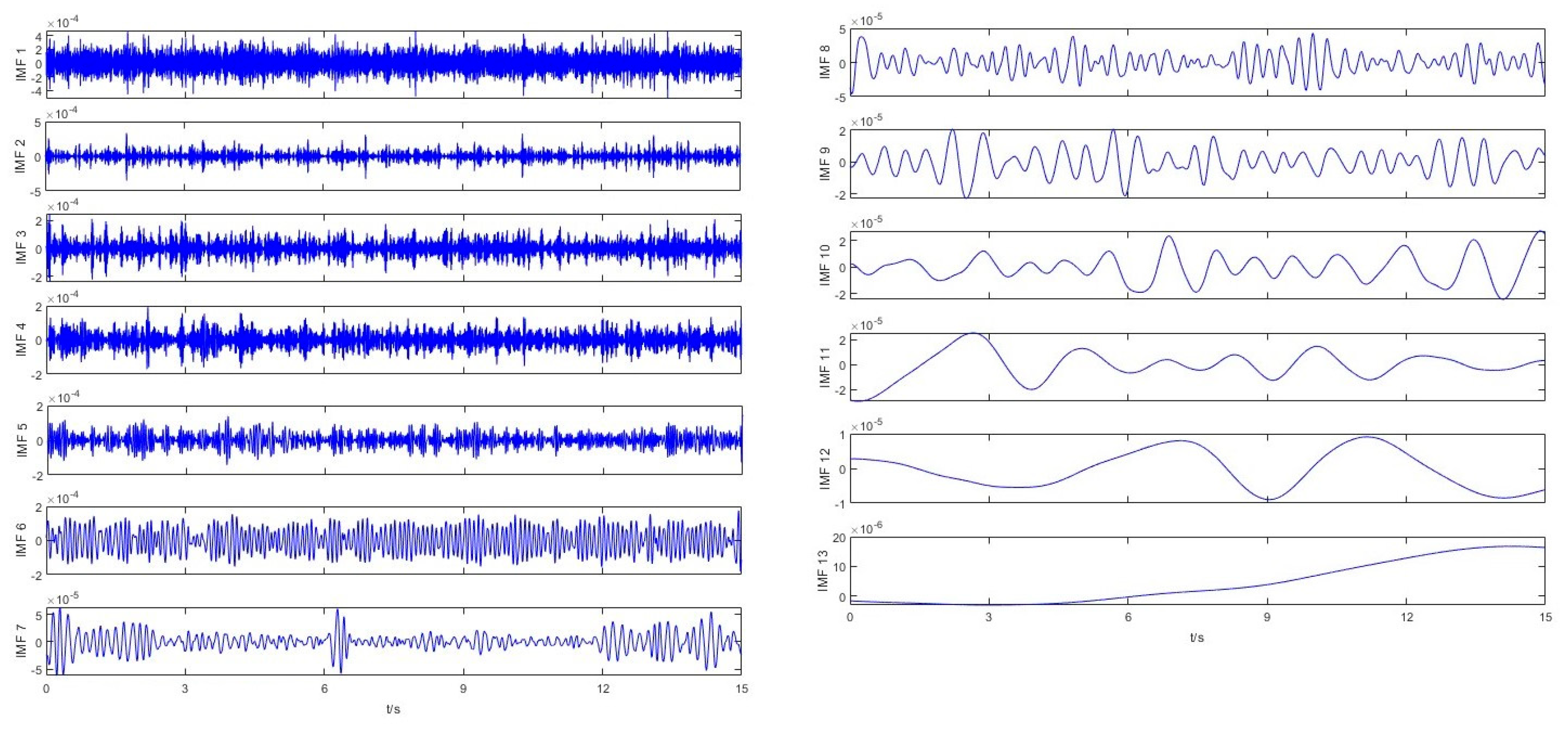First, the injected geoelectric current field signal needs to be decomposed using CEEMDAN. Considering both accuracy and efficiency, the specific parameters for the CEEMDAN denoising algorithm in this study, obtained through multiple experiments, are as follows: the noise standard deviation is 0.2, the number of noise additions is 100, and the maximum number of iterations is 1000. The signal is decomposed into 13 intrinsic mode functions (IMFs), as shown in