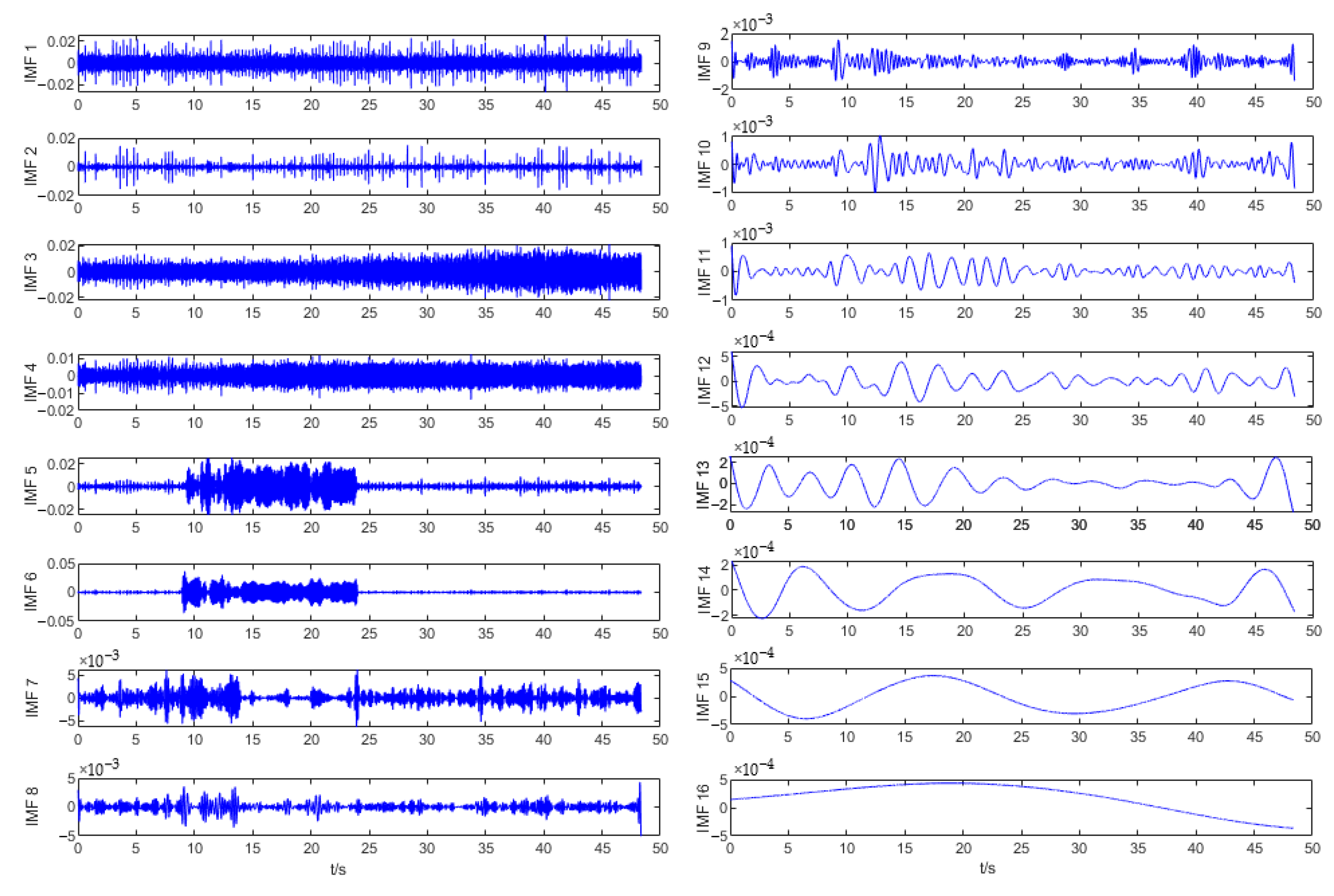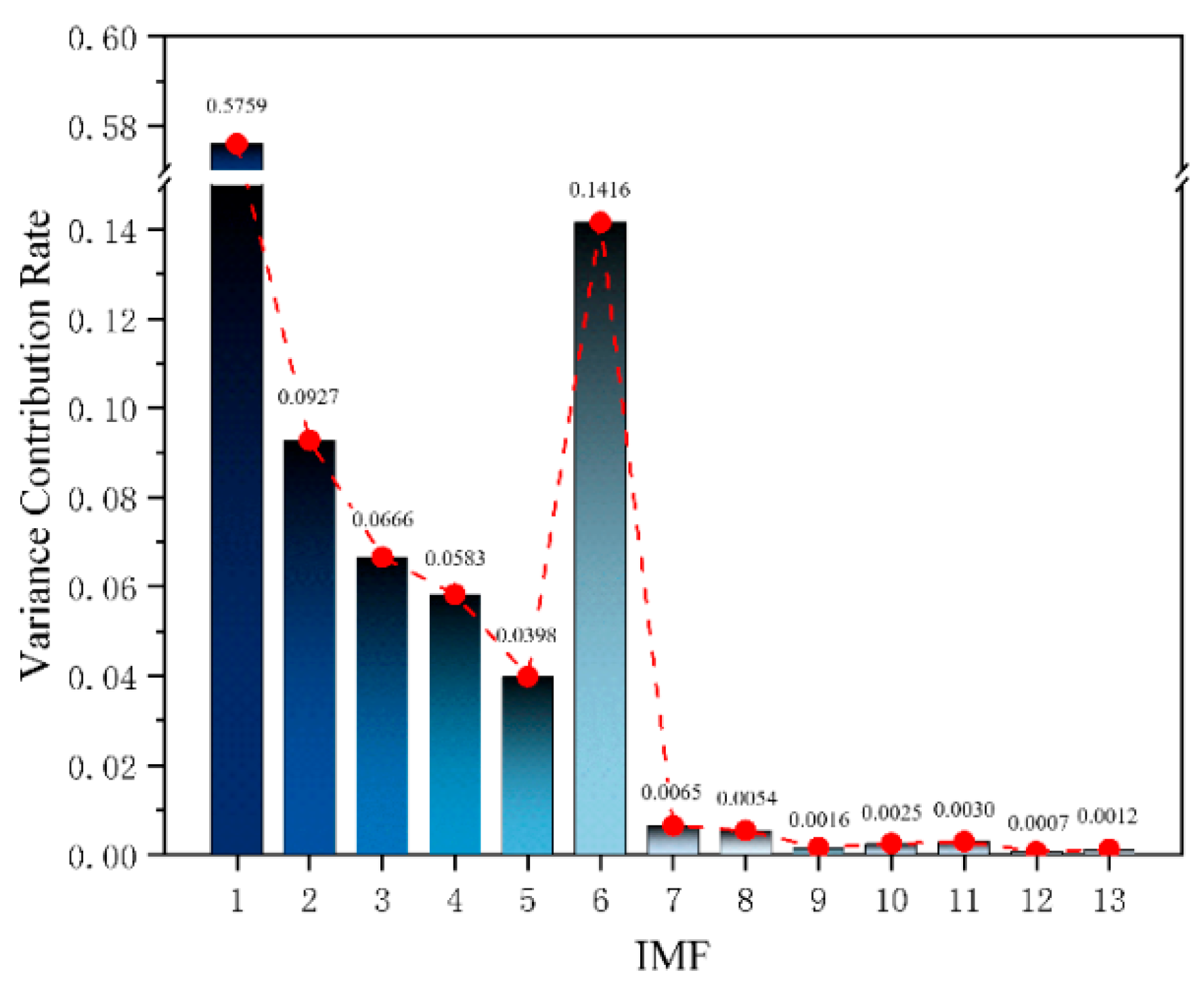 ≤ 0.01, the IMF component carries less than 1% of the original signal information and mainly reflects the random fluctuation characteristics of the noise. This judgment does not depend on the specific type of the signal but is based on the inherent difference in variance contribution between noise and valid signals. Furthermore,