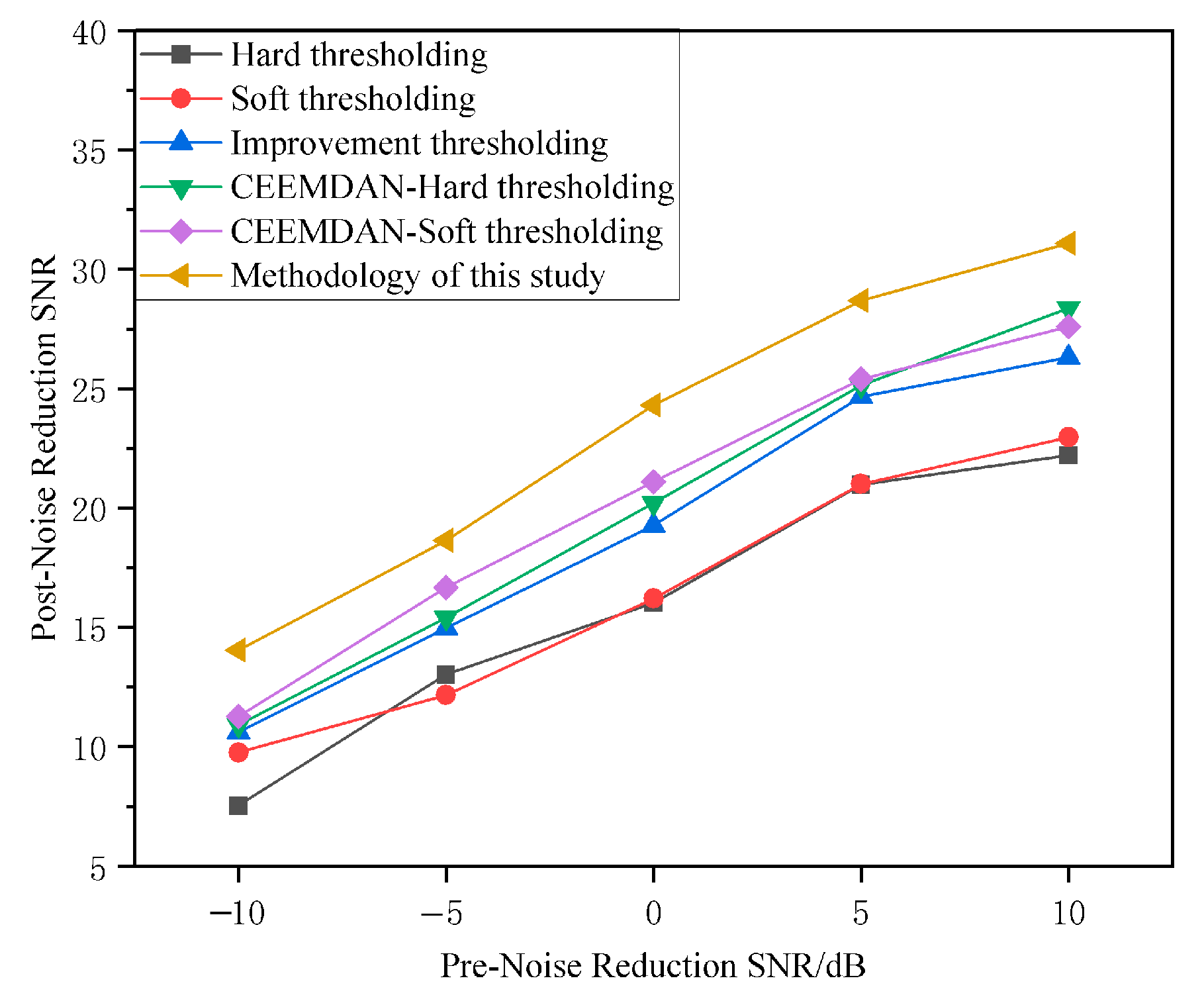 of −5 dB, thresholds of 0.005, 0.01, and 0.02 were set. The performance differences were quantified by comparing the denoised signal’s signal-to-noise ratio (