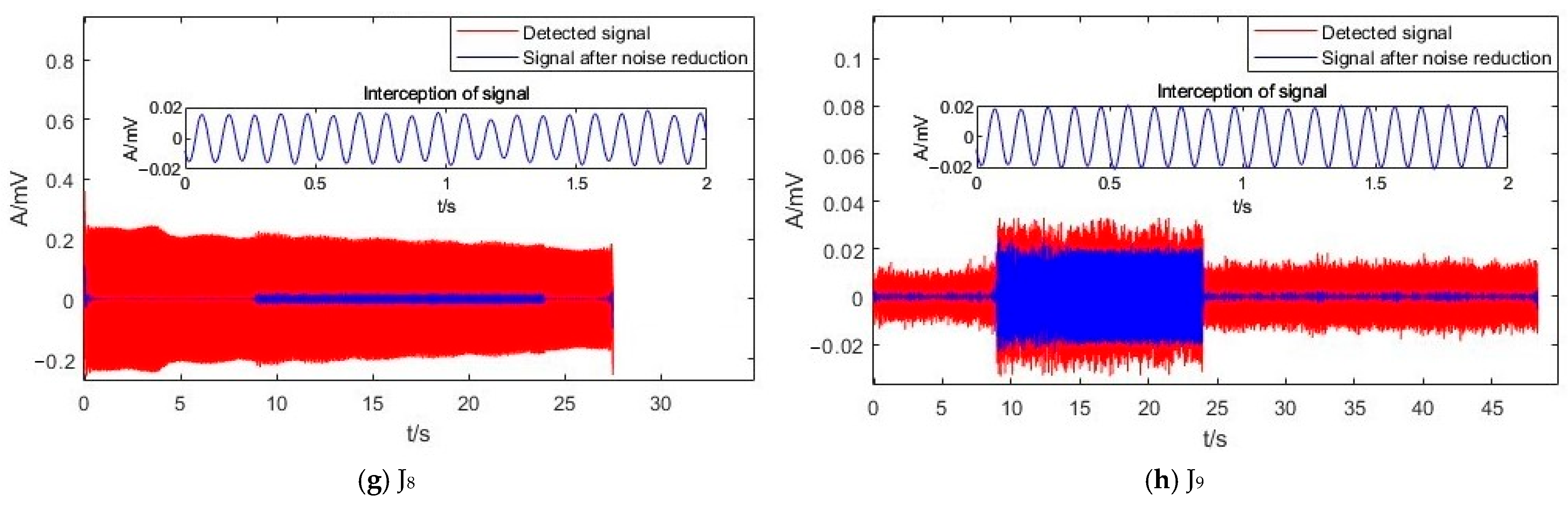 Figure 8a–f. The figure also presents a waveform comparison between the ideal current field signal and the denoised signal in the 9–11 s time interval, along with local enlarged details at three key characteristic positions to highlight the detail retention of different methods.