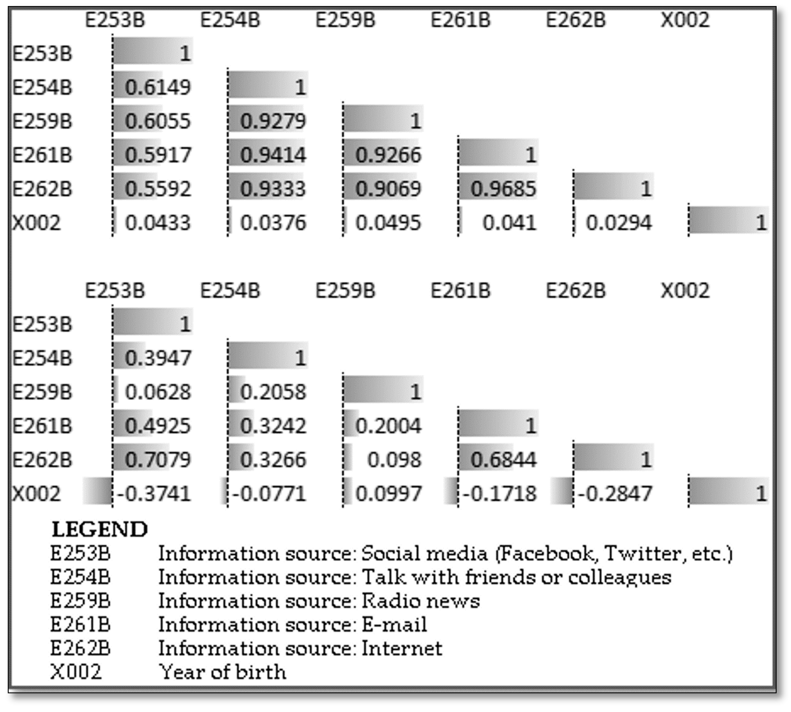 | E253B | Information source: Social media (Facebook, Twitter, etc.) | 1-Daily, 2-Weekly, 3-Monthly, 4-Less than Monthly, 5-Never |