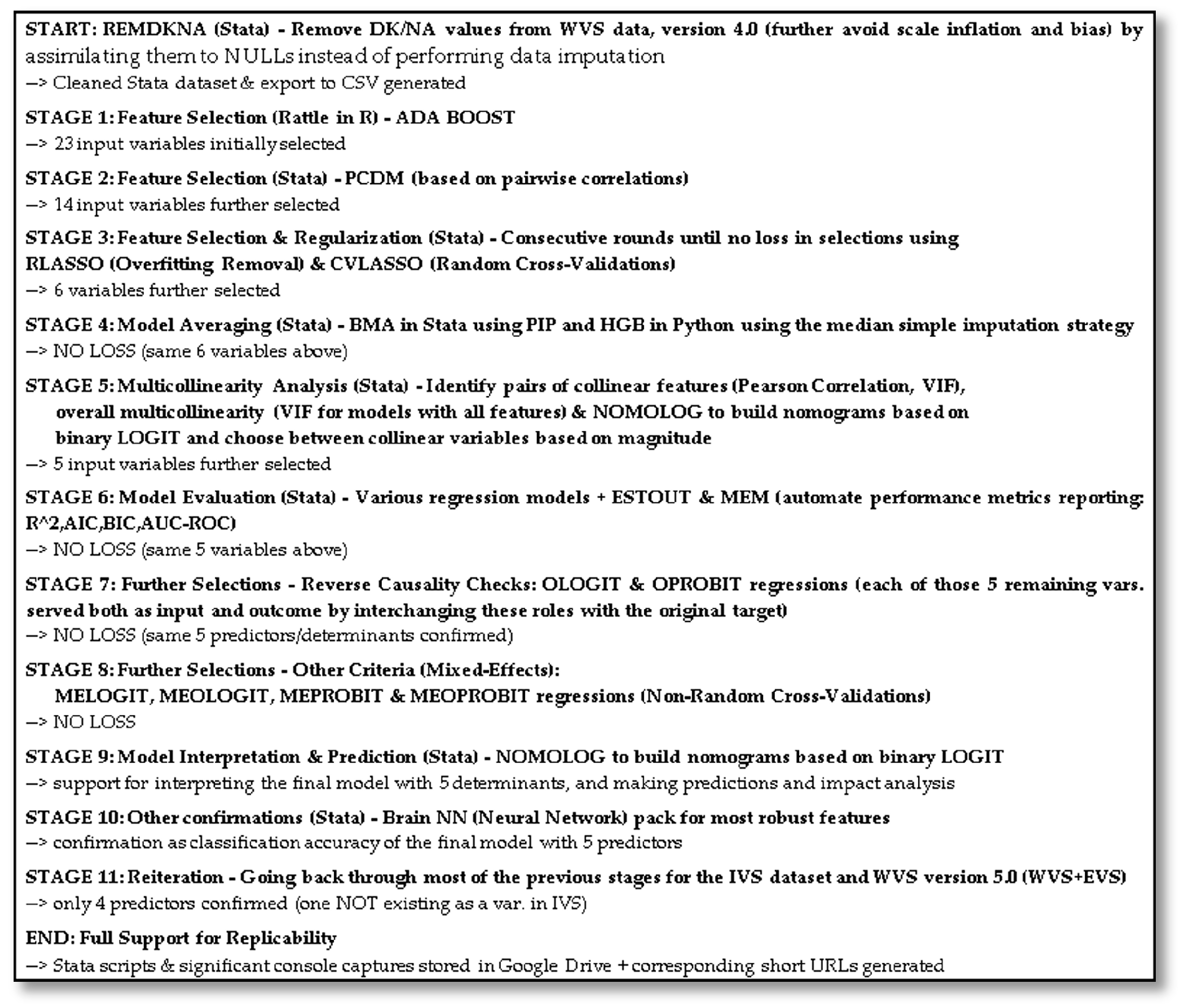| Listing A4. Simple Stata script for performing consecutive selections until convergence using the RLAASO and CVLASSO commands using the WVS dataset (version 4.0). |