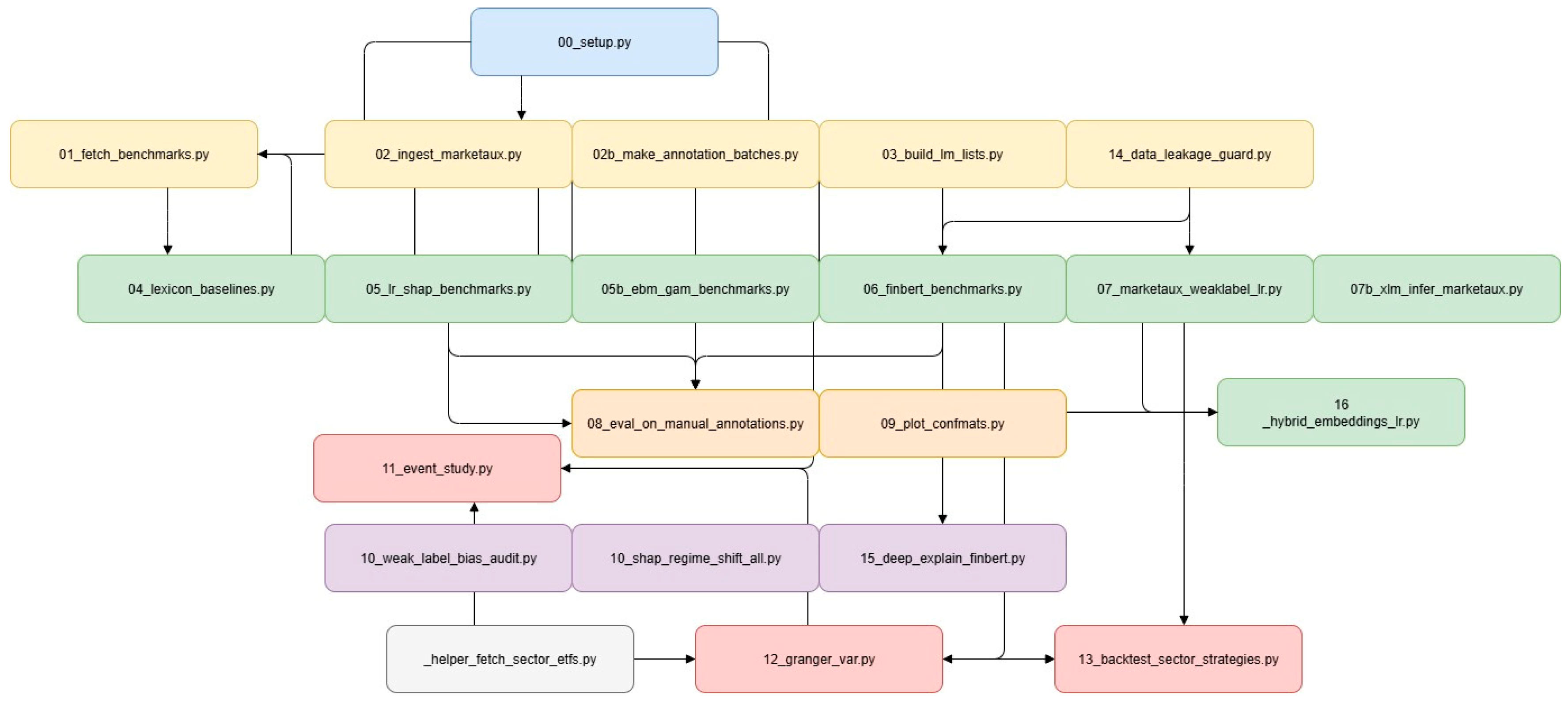 The layout mirrors the narrative of the paper. It guides readers from data acquisition and preparation, through modeling and explainability, and into temporal analysis and econometric validation, before culminating in the final outputs used in the article. Public benchmark datasets are retrieved automatically; domain-specific news data are incorporated via documented procedures that respect licensing constraints. Expert lexicons are provided with clear provenance and simple regeneration paths to ensure legal clarity across jurisdictions.