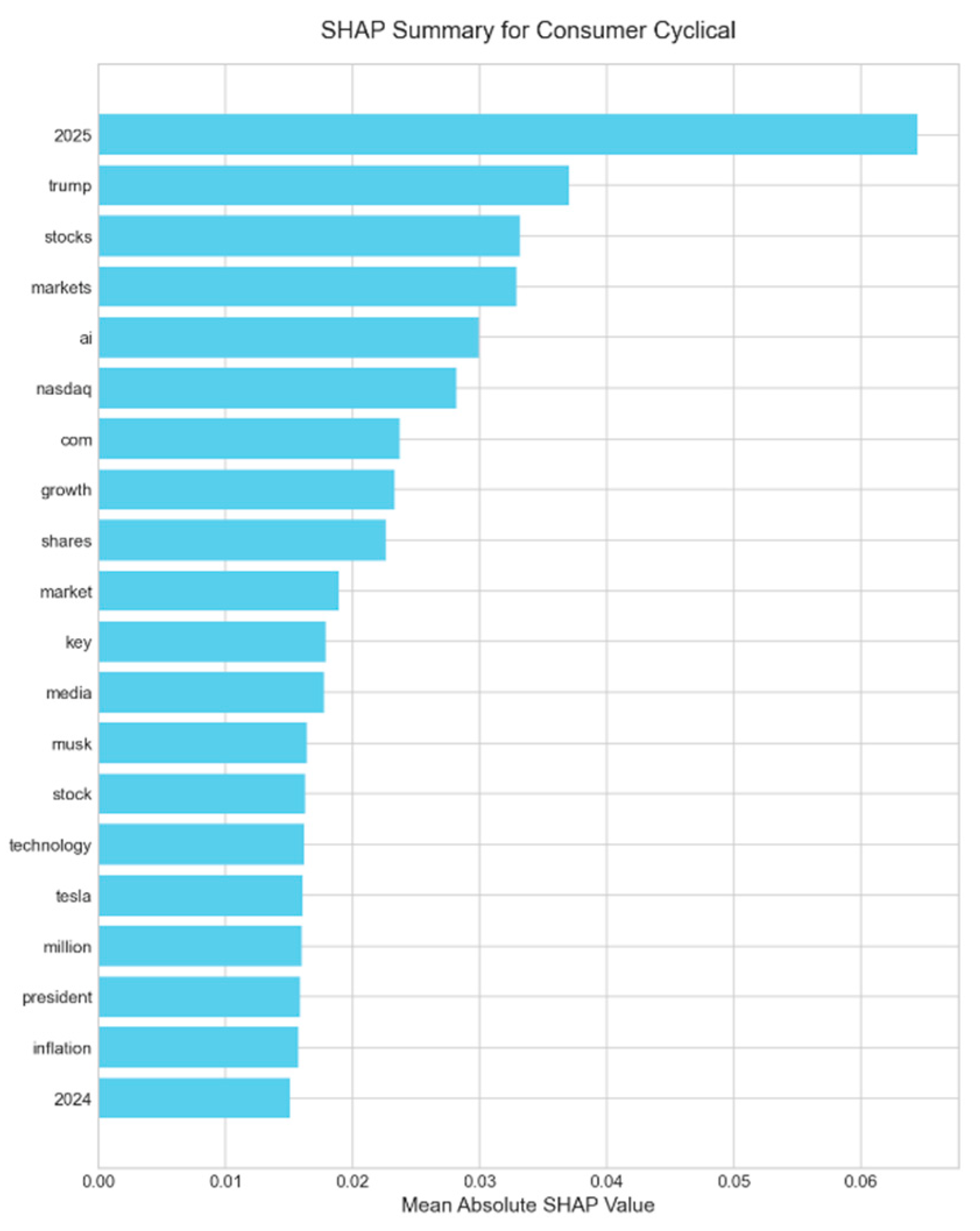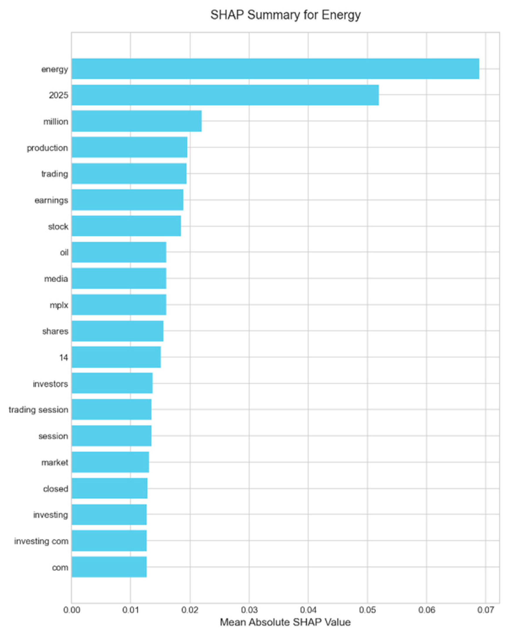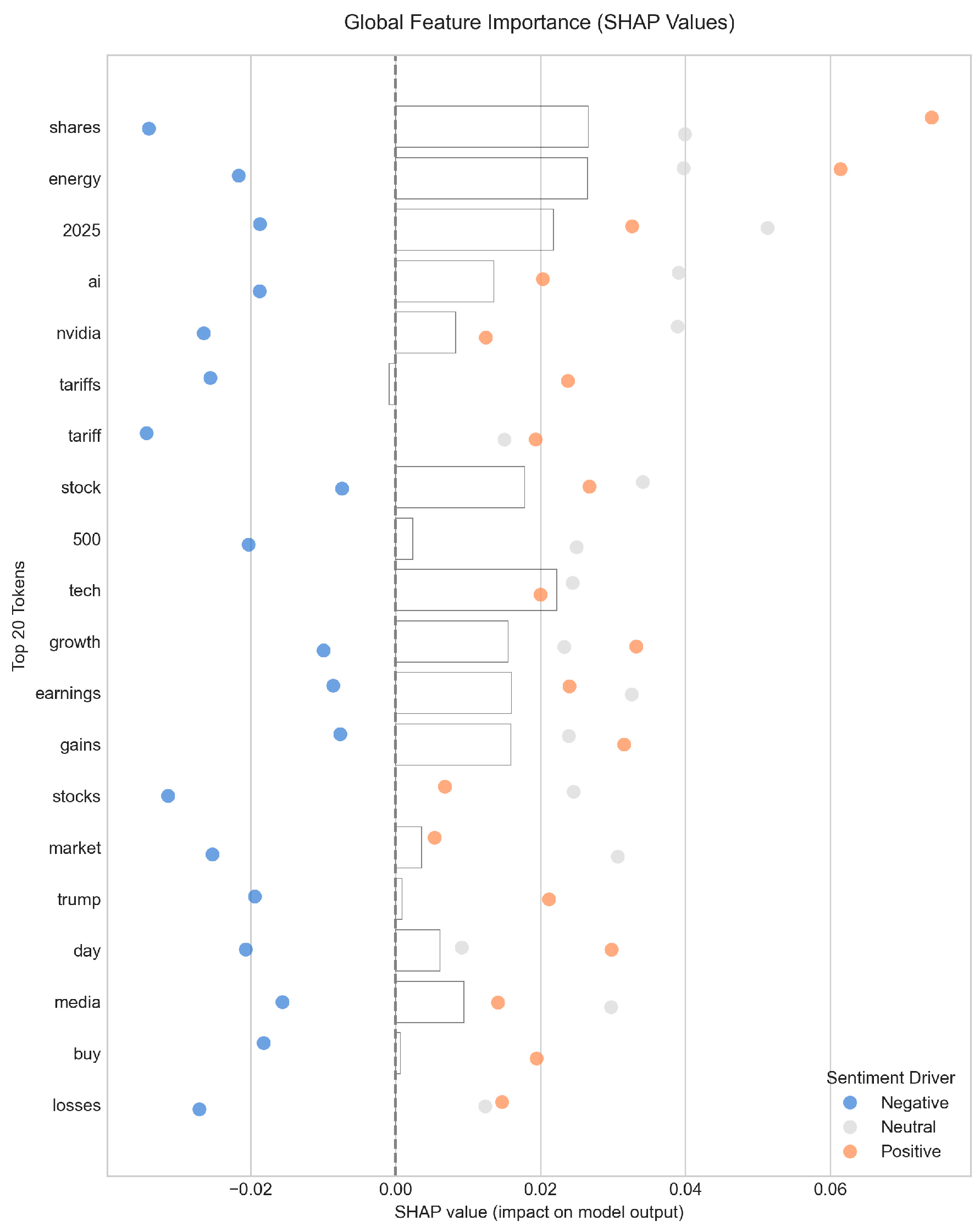 Figure 3, the model learns financially salient and intuitive relationships directly from the data. Terms like “gains,” “growth,” and “earnings” are strong positive drivers, while words such as “losses,” “tariffs,” and “tariff” (a reflection of the geopolitical climate during H1 2025) are correctly identified as primary negative indicators. This confirms that even a simple model trained on noisy labels can extract a meaningful, context-appropriate sentiment lexicon. A detailed breakdown of the key linguistic drivers for each individual sector, which reveals unique terminology (e.g., ‘nvidia’ in Technology, ‘lawsuit’ in Services), is provided in the SHAP summary plots in
