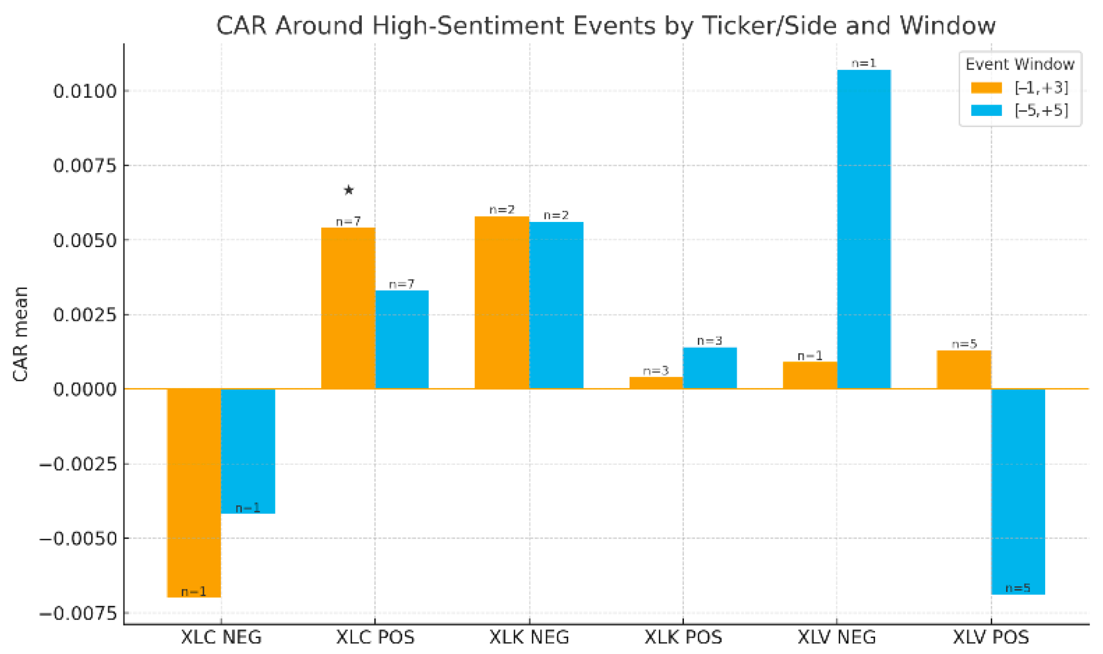 Figure 5) show that spikes in positive news sentiment for Communication Services are followed by statistically significant positive abnormal returns of +0.54% over the subsequent four days (t-statistic = 2.51). This suggests that high sentiment can precede short-term positive market drift in certain sectors.