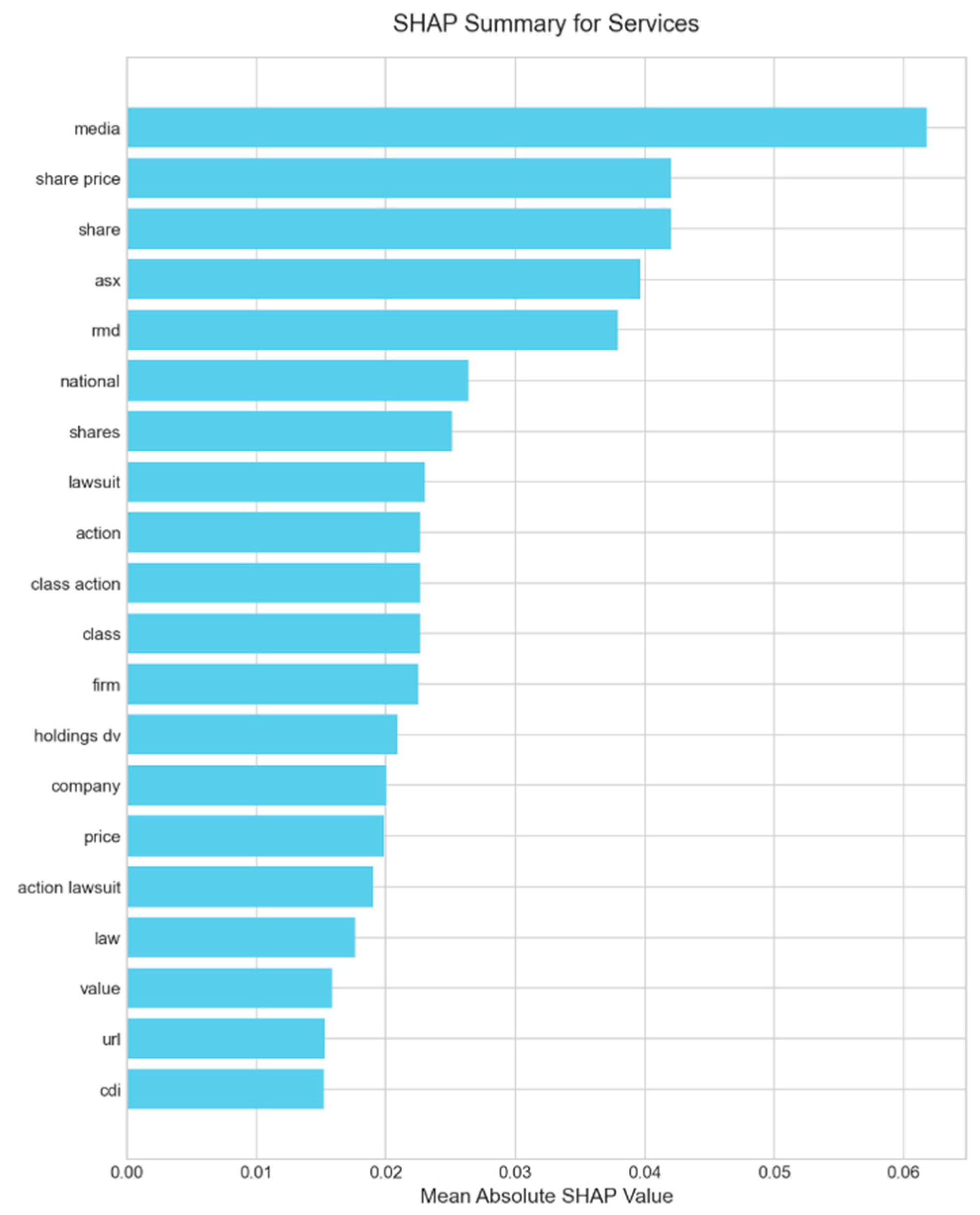 Beyond word-level importance, rule-based rationales (Anchors) and concept-based explanations (TCAV) address the semantic gap by mapping neural reasoning to human-interpretable conditions or higher-level concepts (e.g., “lawsuit,” “AI chips”), which is particularly relevant to domain narratives. While such methods are more common in vision, their recent adaptations to text underscore advantages for global interpretability and auditing spurious correlations (e.g., via concept sensitivity analyses). This motivates our sector-specific analysis, where we compare linguistic drivers across industries using SHAP and evaluate whether attributions align with domain concepts (