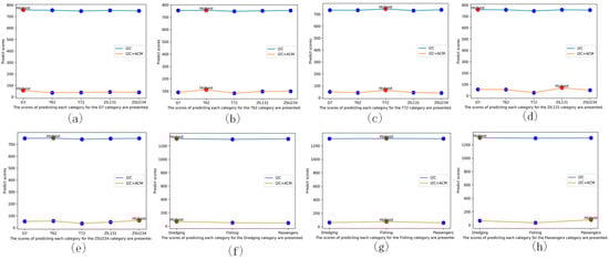 The prediction scores of the query sample and each supported class (similarity scores are calculated under the I2C metric module and ACM module on the MSTAR (a–e) and OpenSARship (f–h) datasets). (a) D7. (b) T62. (c) T72. (d) ZIL131. (e) ZSU234. (f) Dredging. (g) Fishing. (h) Passengers.