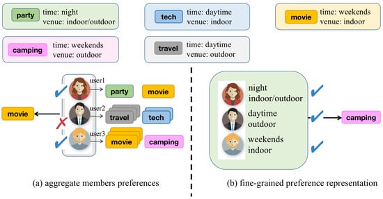 Intuitively, users have different degree preferences for different features such as venue, time, etc. Take an instance, as shown in Figure 1a, user2 prefers to participate in events at daytime but prefers outdoor events over indoor ones. And user3 prefers the event on weekends but has a greater preference for indoor. The difference in one feature may have a significant impact on the user’s behavior. This phenomenon shows that the exploiting of fine-grained feature plays a non-negligible role in accurately capturing user interests and their behavior patterns. Considering this challenge, Lai et al. [] calculate user’s preference scores separately for different features of target event, such as proposing a soft spatial constraint to compute spatiotemporal preference scores. However, these preference scores from various features are simply linearly superimposed and separately computed user preferences across different features, there is a lack of a concise strategy that effectively unifies user preferences across multiple features. More important, users’ different preferences for fine-grained features have a decisive influence in group decision, as shown in Figure 1b, users’ preference for fine-grained features is a decisive factor in group behavior.