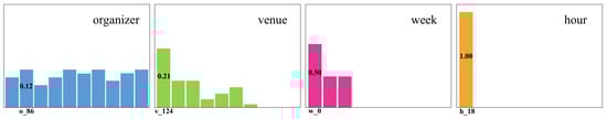 To formalize the significance of fine-grained features for event recommendation, we present the sparse interaction situation between user/group and event, as well as between user/group and fine-grained features in a quantitative manner. We calculate the sparsity of user/group–event interactions and user/group–feature interactions in the Douban-Event and Meetup datasets. The results are shown in Table 1. For each dataset, we randomly select 1000 users and 1000 groups and compute their proportion of interaction with events and each fine-grained feature. Here, the variables represent the organizer, venue, week, and hour features, respectively, as defined in Section 3. From the results in Table 1, we observe that in the Douban-Event, is the smallest, indicating that user–event interactions are the sparsest, while are relatively larger, meaning that user/group interactions with each feature are denser. By contrast, in the Meetup, is smaller than because many of the events attended by a user/group are organized by the same organizer, which leads to a very low values.