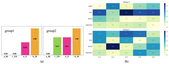 The distribution of attention weights that a single user assigns to the different features when participating in different groups. (a) user preference for features across groups; (b) weight heatmap of features for groups.