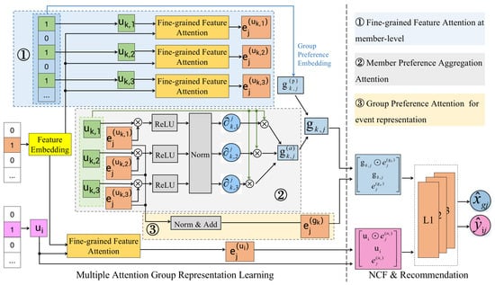 The differences between our MAGER and the general co-attention network as shown in Figure 4. The novelty of MAGER lies first in the use of multi-attention cross-feature to capture the fine-grained features of events, rather than simply aggregating through MLP. Secondly, MAGER includes dual-layer attentions on both user side and group side, while most general co-attention networks only contain a single-layer user–item attention. Most importantly, the attention calculation of MAGER relies on the candidate event context, rather than statically weighting members or historical behaviors. Specifically, the overall architecture of our model MAGER as shown in Figure 5, which illustrates the recommendation tasks in this paper, i.e., recommend well-pleasing events for groups or users. Specifically, the MAGER is divided into three components. The first one is Multiple Attention Group Representation Learning, the second is Neural Collaborative Filtering for modeling group–event interactions and user–event interactions, and the third is Recommendation and Optimization for learning model parameters. In the first component, we design three attention modules: the first one is obtaining the event representation by using fine-grained features (such as ); the second is generating the group ’s aggregated preference embedding based on the preferences of members; the third is obtaining the event representation at the group-level by using fine-grained features.