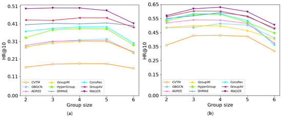 The performance of MAGER for different size of groups for group recommendation task. (a) Douban-Event Shanghai; (b) Meetup Phoenix.