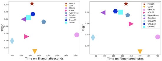 We evaluate the efficiency of our MAGER by comparing the total running time (training plus testing) with all baselines on two datasets, as shown in Figure 8, which shows the HR@5 and running time (seconds/minutes). We conduct the experiments on GPU machines of Nvidia Tesla V100 with 32 GB memory. We can observe that our MAGER performs relatively efficiently on both of the two different datasets, but MAGER still has the best recommendation accuracy compared to baselines. Shanghai and Phoenix are two datasets of different sizes. The model MAGER perform nearly well in terms of efficiency on both datasets of these two sizes.