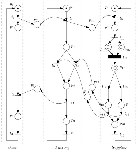 The complete Adaptive Petri Net model is shown in Figure 3, while fuzzy rules extracted from the neural network appear in Table 2, where represents material quality, material cost, and y the selected supplier. The corresponding HPN model (Figure 4) transformed from an APN highlights the sub-net implementing the A-transition from Figure 3. Then we apply the model checking technique to check a property: