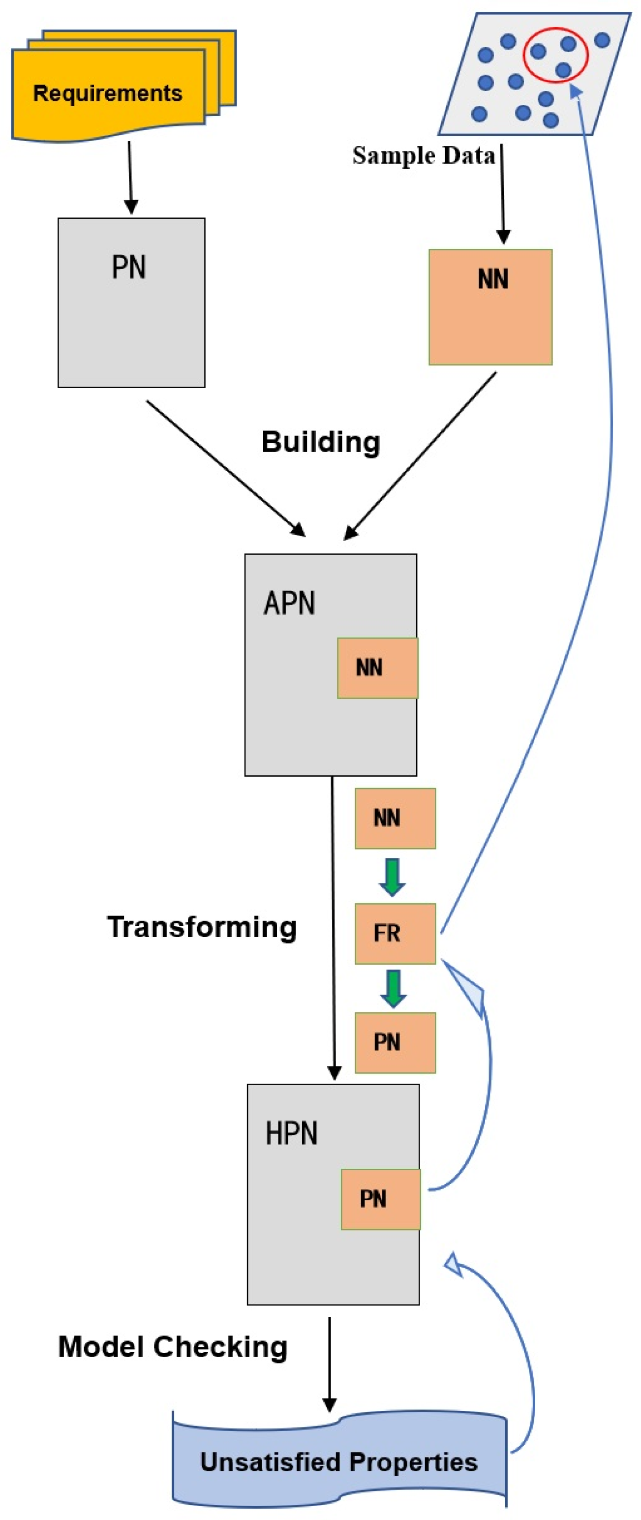 Figure 1, follows a coherent analytical pipeline that begins with the construction of a unified system model from both software requirements and sample data. Components with explicit behavior scenarios are formally captured using Petri Nets (PNs), while those characterized solely by input–output relationships are modeled via Neural Networks (NNs). These elements are integrated into an Adaptive Petri Net (APN), which extends conventional Petri Nets through the introduction of neural network-based A-transitions to represent learning and adaptive behavior. To enable formal verification, the Adaptive Petri Net is subsequently transformed into a Hybrid Petri Net (HPN), making it amenable to analysis by the KeYmaera prover—a specialized tool for hybrid systems. Through model checking, system properties are rigorously verified, and any violations are systematically traced back to fuzzy rules extracted from the neural component. Finally, a novel inverse mapping mechanism links these rules to specific subsets of the training data, thereby identifying the deficient samples responsible for the observed anomalies.