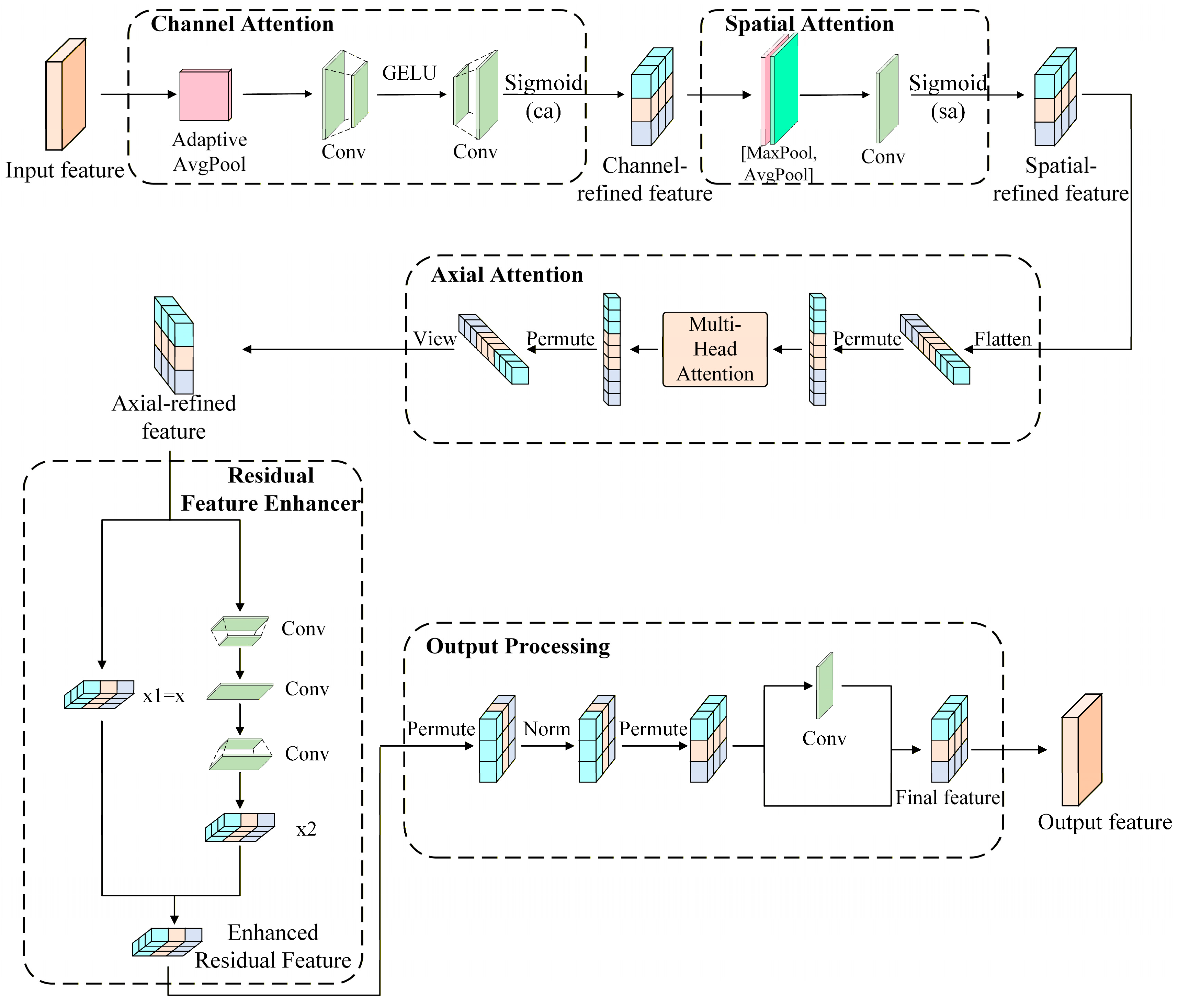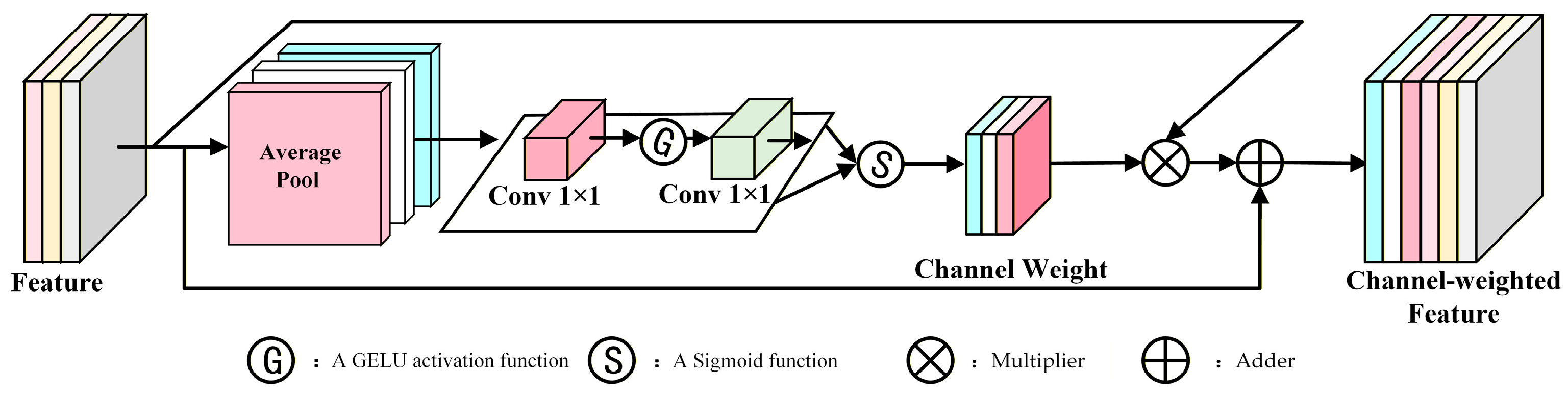 - A 1 × 1 convolution with () channels reduces dimensionality to capture key inter-channel correlations efficiently. A GELU activation function follows this to model complex channel dependencies. Subsequently, A 1 × 1 convolution with channels is used to perform up-sampling, further strengthening the feature representation.