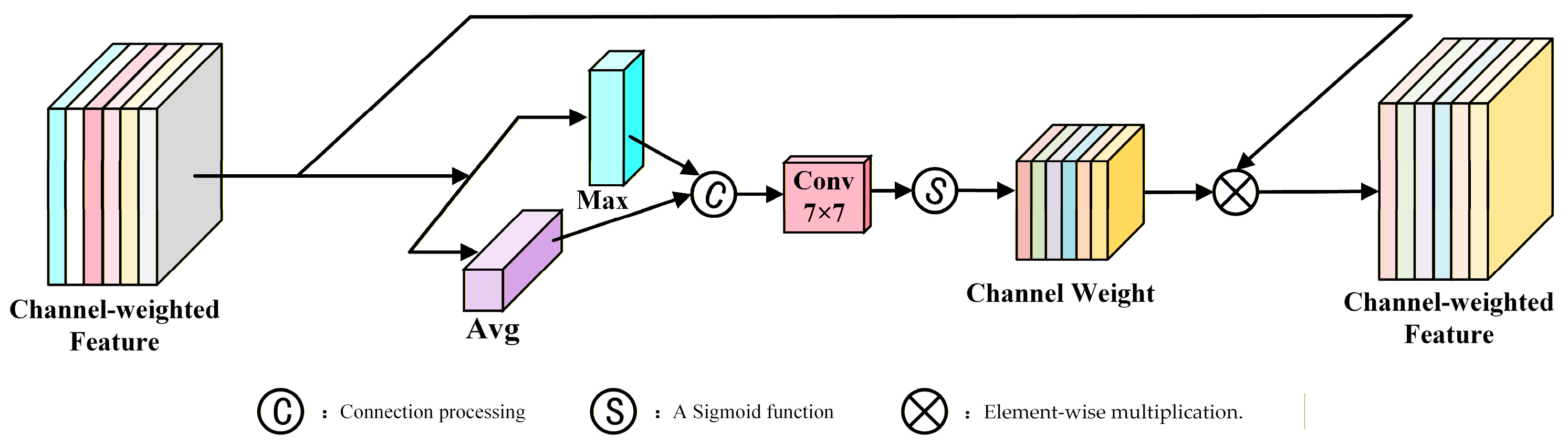 - The maximum and average values along the channel dimension of the channel-weighted features are extracted to capture both key regions and overall distribution traits. The calculations of and are shown in Equation (7):where max() and mean() represent the highest and average value across all spatial positions within each channel.