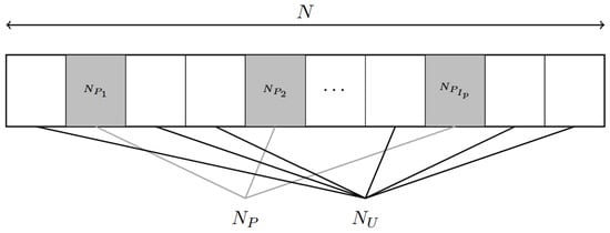 In the simulation setup, we have scattered pilots with indices . For larger arrays, pilots are generated per-transmitter with 16-subcarrier spacing (4 pilots per T), so and . The resulting subcarrier layout is illustrated in Figure 1.