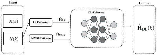 The proposed DL-Enhanced has two lightweight learning phases integrated with classical processing: a channel-level fusion that performs a convex magnitude combination of and under a simplex constraint while restoring the LS phase, and a symbol-level I/Q denoiser applied after linear MMSE equalization. A single decision-directed iteration refines the channel estimate using reliable hard decisions, and final detection uses MMSE equalization. At the channel estimation level, a compact fusion MLP consumes physics-inspired features distilled from the LS and MMSE estimates. At the symbol-processing level, a per-transmitter I/Q denoiser MLP is applied after linear MMSE equalization to refine the in-phase and quadrature components. This combination reduces the structural channel-estimation error while preserving the phase and mitigates residual post-equalization noise at negligible additional complexity.