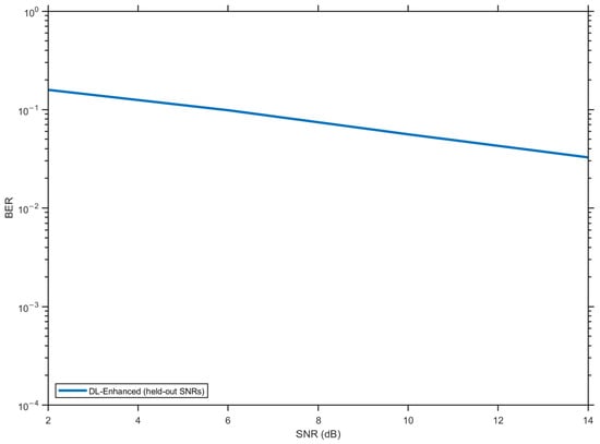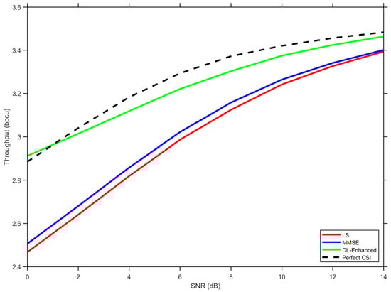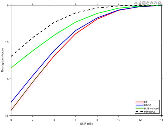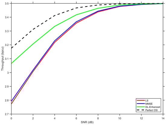 Figure 9 illustrates the throughput performance across the considered SNR range. At a low SNR (0–5 dB), all methods suffer from significant BER-induced capacity loss, with LS performing worst due to its higher error floor. The DL-Enhanced approach maintains a consistent advantage over both baselines, approaching the perfect CSI bound more closely as the SNR increases.