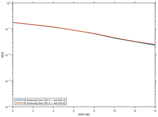To quantify the contribution of each module, we perform an ablation study for the QPSK CDL-C scenario, comparing (i) LS, (ii) MMSE, (iii) LS/MMSE fusion without decision-directed refinement (“DL-Enhanced”), and (iv) the full hybrid estimator with one decision-directed iteration (“DL-Enhanced + DD”), see Figure 19. The fusion-only variant yields BER curves that closely track the MMSE baseline across the SNR range, indicating that the LS/MMSE combination is essentially lossless and provides only a modest gain over MMSE. In contrast, adding the decision-directed refinement produces a consistent BER reduction, typically on the order of 3–4 dB at BER levels between and . This confirms that the decision-directed refinement is the main driver of the performance gains of the proposed hybrid estimator.