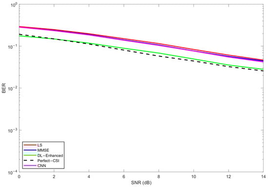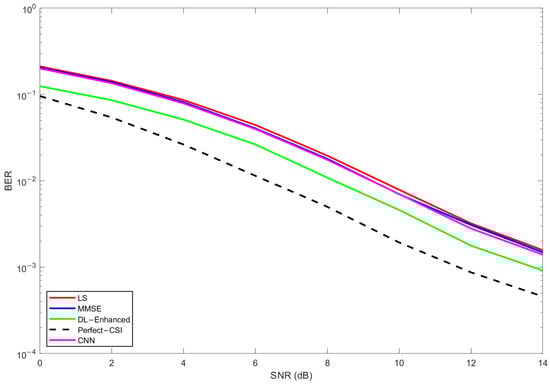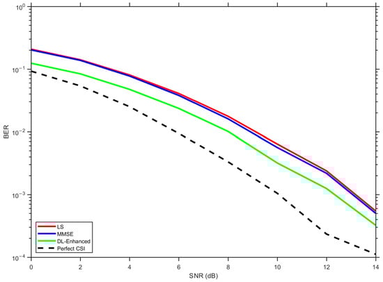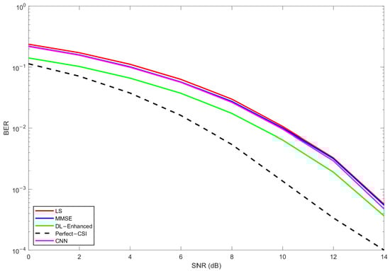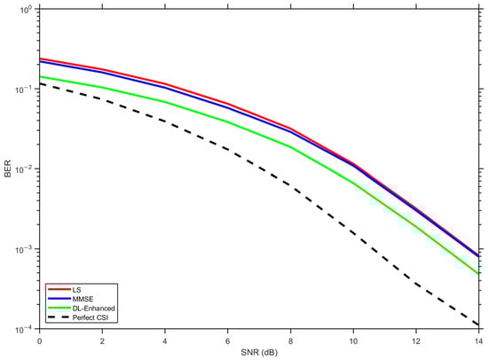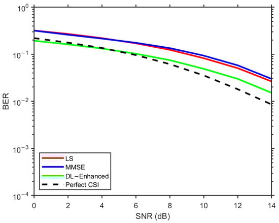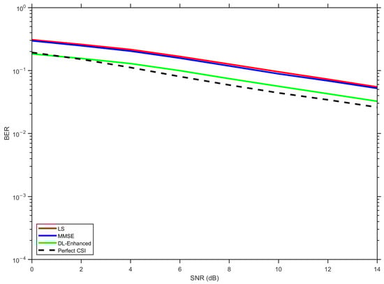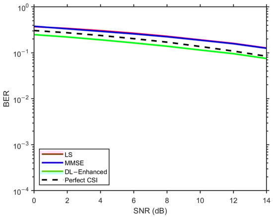 In Figure 14, corresponding to the configuration, LS exhibits the highest BER over the entire SNR range, MMSE provides a clear improvement owing to its use of delay-domain statistics, and the proposed DL-Enhanced estimator yields the best performance among the practical schemes. The gap between DL-Enhanced and MMSE becomes more pronounced at medium-to-high SNRs (around 10–14 dB), where the effect of phase errors is more critical for 16-QAM. In this regime, the magnitude-domain fusion of LS and MMSE, combined with LS-based phase anchoring and a single DD refinement, effectively limits phase sensitivity and prevents additional error floors, allowing the hybrid curve to track the perfect CSI reference more closely.