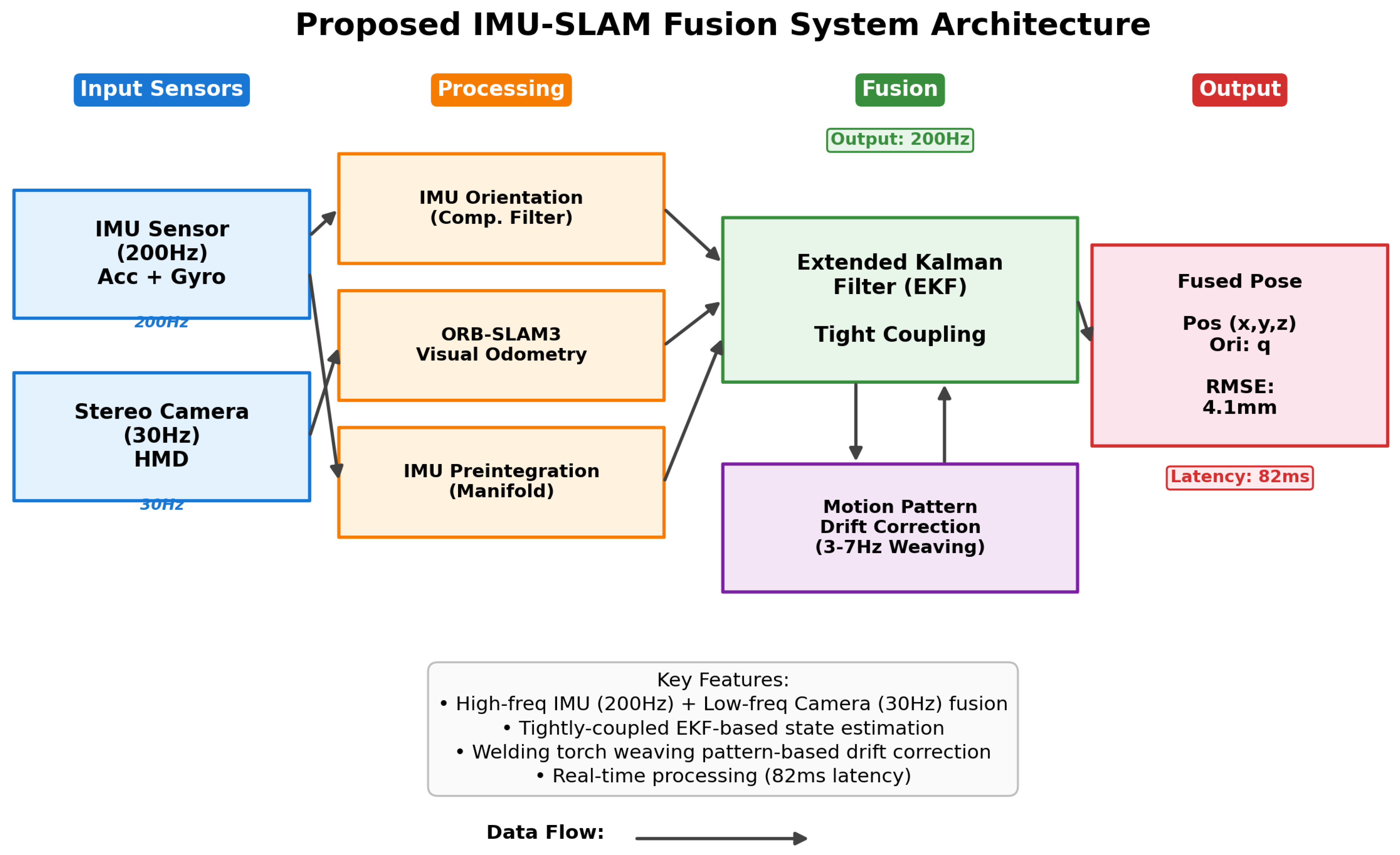 - We present mathematical formulation of an Extended Kalman Filter (EKF)-based fusion framework integrating welding-specific motion models (high-frequency weaving, constant travel speed) that were ignored by existing VI-SLAM.