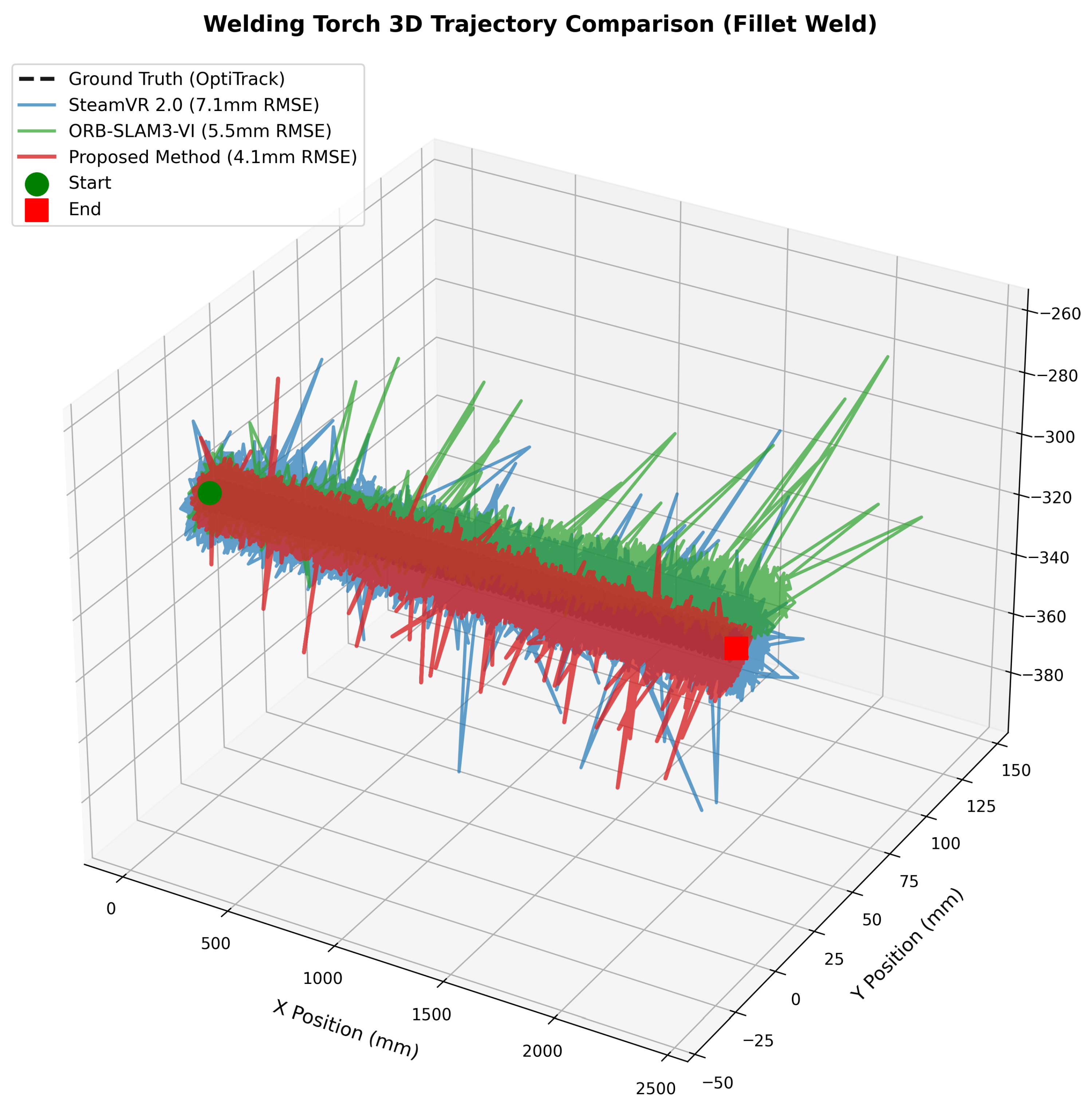 - Overhead weld: Performed with torch pointing upward, causing IMU gravity reference direction to be disadvantageous. Additionally, the arm-raised posture causes frequent camera occlusion. Presents the most challenging conditions from a tracking perspective.