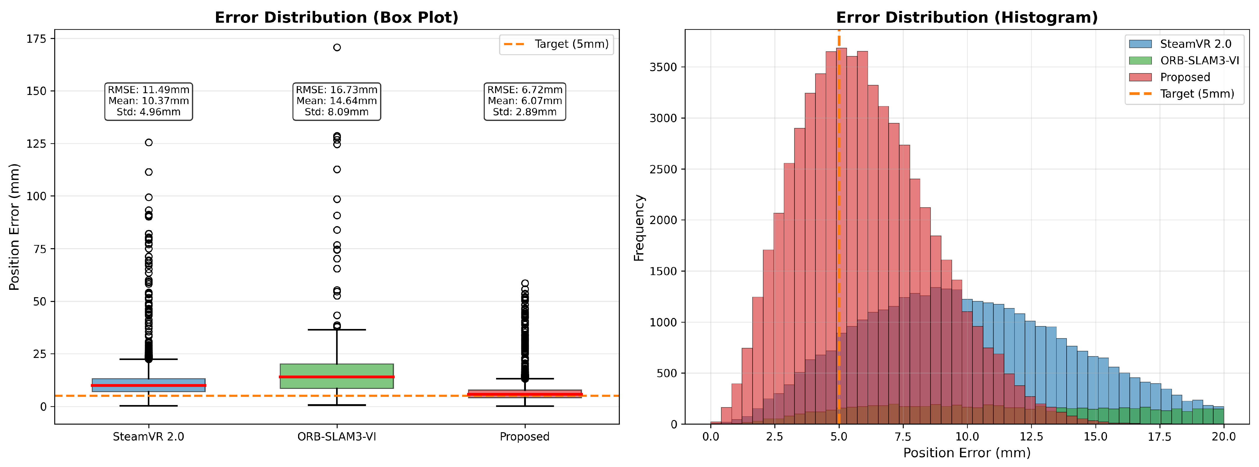 - We conduct the first comprehensive experimental validation in the VR welding training context, including a quantitative comparison with commercial trackers using the OptiTrack motion capture system as ground truth.