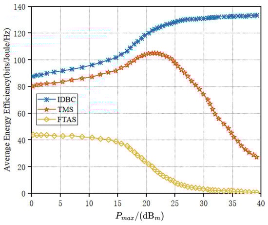 As depicted in Figure 3, under varying maximum transmit powers of the UAV, the three distinct strategies exhibited different average energy efficiencies. From the blue-marked lines, we can see that in the IDBC scheme, the average energy efficiency increased as the transmit power of the UAV increased. However, after reaching a certain power threshold, around 25 , the energy efficiency slowed down its increasing trend and gradually reached a stable state. This is because after exceeding a certain point, increasing the transmit power only resulted in a rise in energy consumption rate, whereas the collection rate remained constrained. Nevertheless, the energy efficiency exhibited by the other two comparative algorithms demonstrated a slightly different pattern that it first increased with the transmitting power, within a certain range, and after some point, it started to decrease instead. To explain this, we use the TMS scheme as an example. The TMS scheme’s primary objective is to improve system throughput. Thus, when the system throughput reaches the current system capacity, the throughput is not increasing any longer while the energy consumption keeps going up, resulting in a decrease in system energy efficiency after that. This is similar to the FTAS scheme, in which the primary goal is fixed-time allocation. Overall, among the three schemes, our proposed IDBC achieved the optimal performance in terms of average energy efficiency.