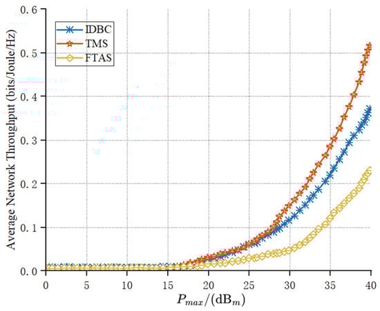 As depicted in Figure 4, under different maximum transmit powers of the UAV, the three algorithms exhibited different performances in terms of the average network throughput. From a general view of the figure, it can be observed that the average network throughput improved with the increase in transmit power, and this is because increasing transmit power leads to an improvement in the energy harvesting rate, thereby enhancing the average network throughput of the system. Since all three schemes operated under the same energy constraints and time constraints, and therefore under the same conditions, the average network throughput improved with the increase in the UAV’s transmit power. This phenomenon indicates that within a certain power range, increasing the transmit power can improve the system performance in terms of network throughput. Among the comparison schemes, the average throughput performance obtained by the TMS was superior to the IDBC.