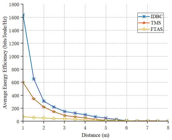 Figure 5 illustrates the relationship between the average energy efficiency and the distance from nodes to the UAV () among the three compared algorithms. As observed from the drawn curves, the average energy efficiency of the system gradually decreases as the distance between the nodes and the UAV increases. The main reason is that a shorter distance results in better channel gain, thereby enabling more efficient energy utilization, whereas a greater distance between nodes and the UAV leads to increased energy loss during transmission. Optimally deploying node positions allows nodes to harvest more energy for information and data transmission, thereby improving system throughput and energy efficiency, which is an essential aspect in practical network design. Furthermore, Figure 5 shows that our proposed IDBC scheme exhibited the optimal performance in terms of energy efficiency performance.
