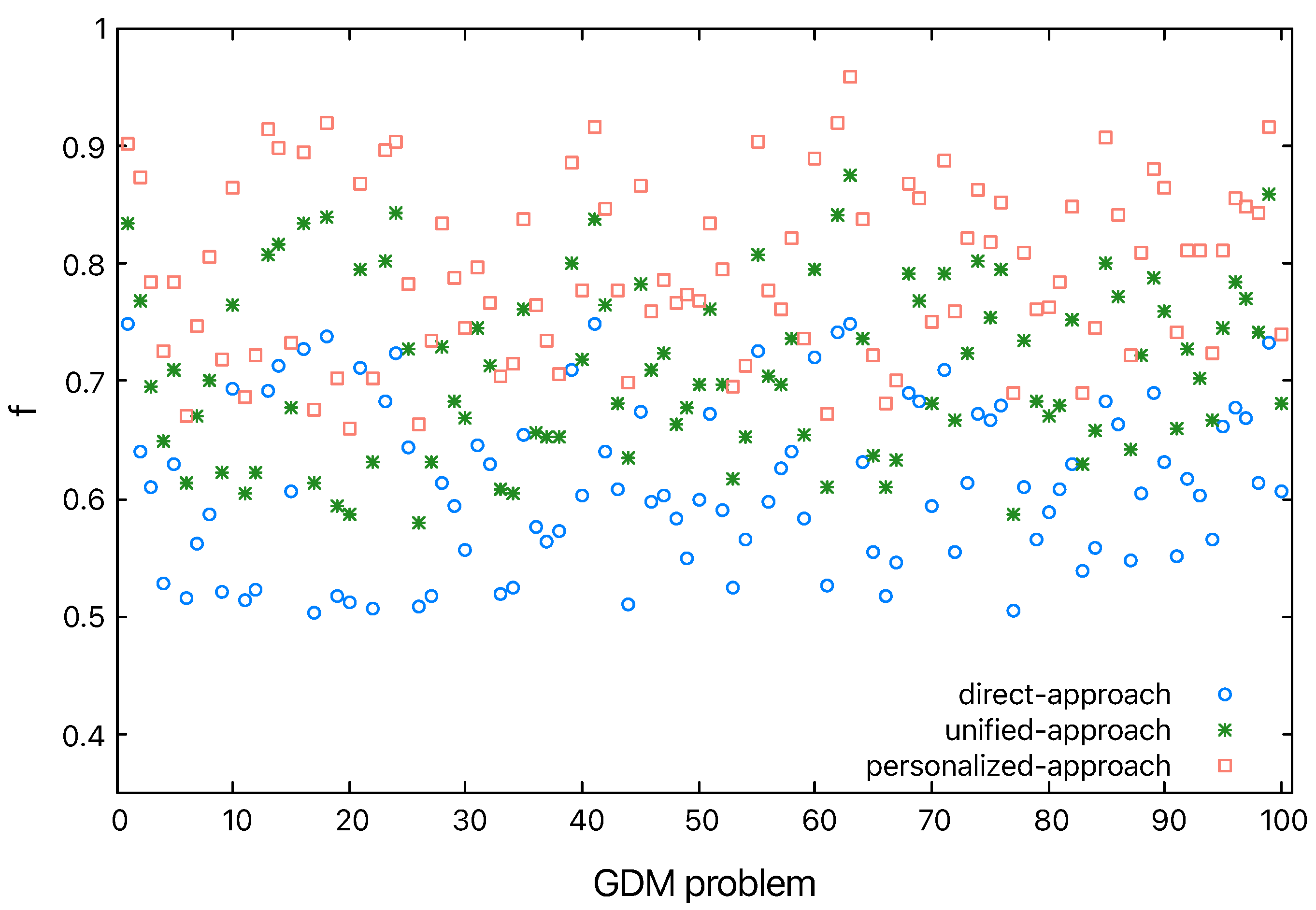 f (global consistency level) achieved by each approach. The values for the granular approaches (the unified-approach and personalized-approach) are clearly higher than those for the direct-approach. This suggests that granular approaches can operationalize linguistic values and enhance consistency. Additionally, the values from the personalized-approach are higher than those from the unified-approach. This result verifies the superiority of the proposed approach, which achieves greater consistency levels by personalizing the semantics of the linguistic values.