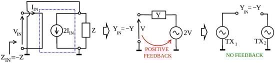 A typical non-Foster active matching network based on a current amplifier (Figure 2, left) could be transformed into a voltage-controlled voltage source network (Figure 2, middle). Both networks generate an equal input negative admittance -Y required to cancel out the reactive part of antenna admittance, but, unfortunately, both circuits comprise positive feedback. The proposed concept with two coherent transmitter sources (Figure 2, right) [15] is feedback-less, while at the same time, by manipulation of TX1 and TX2 respective amplitudes and phases, this arrangement effectively emulates the equal negative input admittance -Y at its port, just as the former two circuits.