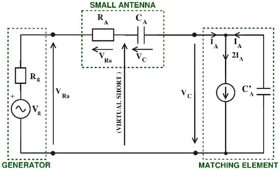 The generator on the left in Figure 3 is a realistic voltage source with amplitude Vg and internal resistance Rg, while a short dipole antenna is modeled with a series combination of radiation resistance RA and capacitance CA.