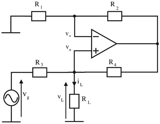 This results in mesh voltages and currents in the network that are equal to those that would be present in the case of non-Foster matching. In other words, such a circuit mimics the non-Foster matching but without positive feedback. Although the basic idea appears to be quite straightforward and simple, its realization is rather challenging. Current sources are rarely used in RF engineering, especially the ones capable of operation in a wide frequency range. The development of an adequate circuit was indeed a challenging task, and a number of solutions were first considered and tested in simulations. Finally, a circuit based on Howland’s current pump [17] was constructed and tested. Basically, Howland’s current pump can be realized in its simplest form with a single differential amplifier and resistors R1, R2, R3, and R4 as the feedback network around it (Figure 4).