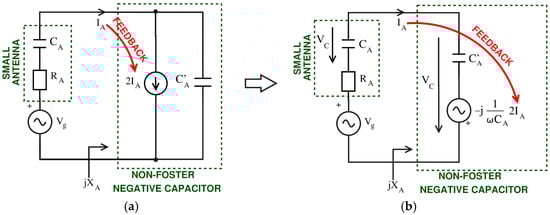 Since current sources in the RF frequency range are inconvenient and hard to practically realize, there is a workaround to avoid the current source by transformation of the 2IA-CA’ shunt network to an equivalent Thevenin voltage generator Vg’ with series CA’ (Figure 8b) [21]. Thevenin transformation is still applicable for both transmitting and receiving systems, and the operation of non-Foster circuits based on voltage-mode devices has been experimentally verified [22]. The network in Figure 8b can be realized with a current-controlled voltage source (CCVS) (i.e., a trans-impedance amplifier), using a sensing signal of antenna current IA as the input. It is still a non-Foster network with positive feedback, and further development towards the feedback-less system is possible exclusively for transmitting systems. Instead of quite uncommon CCVS, it is much simpler to make use of a voltage-controlled voltage source (VCVS), which is just another name for a voltage amplifier. The supplementary generator Vg’ should provide voltage equal to