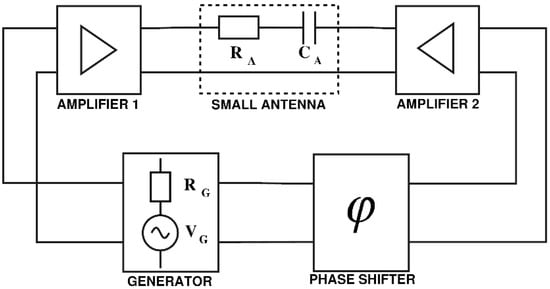 Electrically small antenna (ESA) refers to an antenna with physical dimensions much smaller than its operating free-space wavelength [1]. The self-impedance of electrically small antenna is predominantly reactive, while its real part is low. This yields a high Q-factor, which determines the ratio of time-averaged stored energy within the antenna structure to the sum of radiated and dissipated energy. Such impedance characteristics of small antenna results in the low efficiency of power transfer between the antenna and the receiver or transmitter [2]. A classic way to improve power transfer between the antenna and the circuitry is the inclusion of a lumped-element matching network (Figure 1a). However, such a solution comes with a serious drawback imposed by the fundamental Bode–Fano limit; passive (lumped-element) matching is inherently narrowband [3]. One workaround for the Bode–Fano limit is the application of non-Foster elements in matching (Figure 1b) [4]. Non-Foster elements are active electronic circuits that mimic the behavior of hypothetical negative capacitors and negative inductors. The most common approach to non-Foster elements for antenna matching is based on amplifiers with positive feedback that generate required negative input impedance. More specifically, those circuits convert a load impedance into its “negative image” and, therefore, they are usually referred to as negative impedance converters (NICs) [5]. The presence of positive feedback is mandatory in order to generate a phase-shifted response signal (voltage or current). This signal is then superimposed to the original signal in the circuit to cancel out the voltage drop over the reactive part of the antenna impedance. Such a technique results in the antenna impedance, as “seen” by the connected circuitry (receiver or transmitter), appearing to be a real number, consequently improving the efficiency of the small antenna application extensively. This is a well-known principle of non-Foster matching [6,7]. Since the non-Foster elements are built upon the circuits with positive feedback (NICs), they are extremely prone to instability [8,9], i.e., to unwanted oscillations.