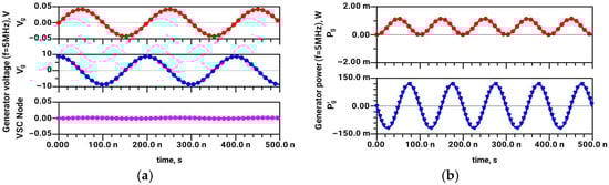 Time-domain simulated (a) voltages of generator Vg (in-phase), generator Vg’ (quadrature), and voltage at the node between RA and CA (virtual short circuit to ground, “VSC Node”); (b) instantaneous power flow from respective generators Pg and Pg’.