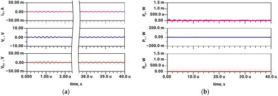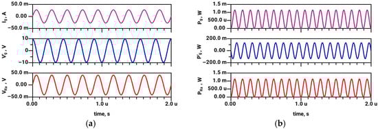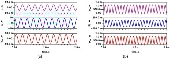 The results in Figure 14 (passive case) reveal that the steady-state voltage VL at the matching element (inductor) is substantially lower than in Figure 12. This is expected, as the frequency 4.5 MHz differs from the matching (resonant) frequency of 5 MHz, and passive matching is inherently narrowband [2]. Consequently, the antenna radiated power at 4.5 MHz in Figure 14 is several orders of magnitude lower compared to the radiated power PRa in Figure 12. On the other hand, all of the observed voltage and power levels in the active (dual-source) system are nearly equal at 5 MHz (Figure 13) and at 4.5 MHz (Figure 15). Thus, one could confirm that antenna matching is broadband in the case of an active two-generator system.