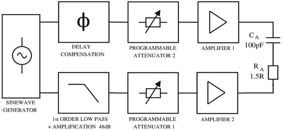 The proposed dual-source concept was verified on an experimental demonstrator setup (Figure 16 and Figure 17). In order to provide a sufficient voltage swing at the antenna, which is, for a high-Q antenna, considerably high, RF amplifiers with higher voltage supply rails should be utilized at both sides of the antenna bridge. Hence, dedicated amplifier blocks were constructed for this purpose. It has also been taken into consideration that a low-pass filter operating far below its cutoff frequency inevitably imposes significant attenuation in a signal path, therefore a cascaded three amplifier gain stage block had to be included in a low-pass filter path. Total voltage gain of this block is A = 250, and it is realized with three HFA1130 current-feedback RF OPAMPs [25]. Time-domain simulations with actual amplifier models revealed that the phase delay of those three stages combined is not negligible. In order to compensate for the phase delay, a three-stage unity-gain amplifier block was included in the path of main generator Vg (Figure 16 and Figure 17) as a phase delay compensation. The cutoff frequency of the low-pass filter (that provides -90° phase shift) is 100 times larger than the operation frequency of the system, which in turn results in a negligible phase error of merely 0.6°.
